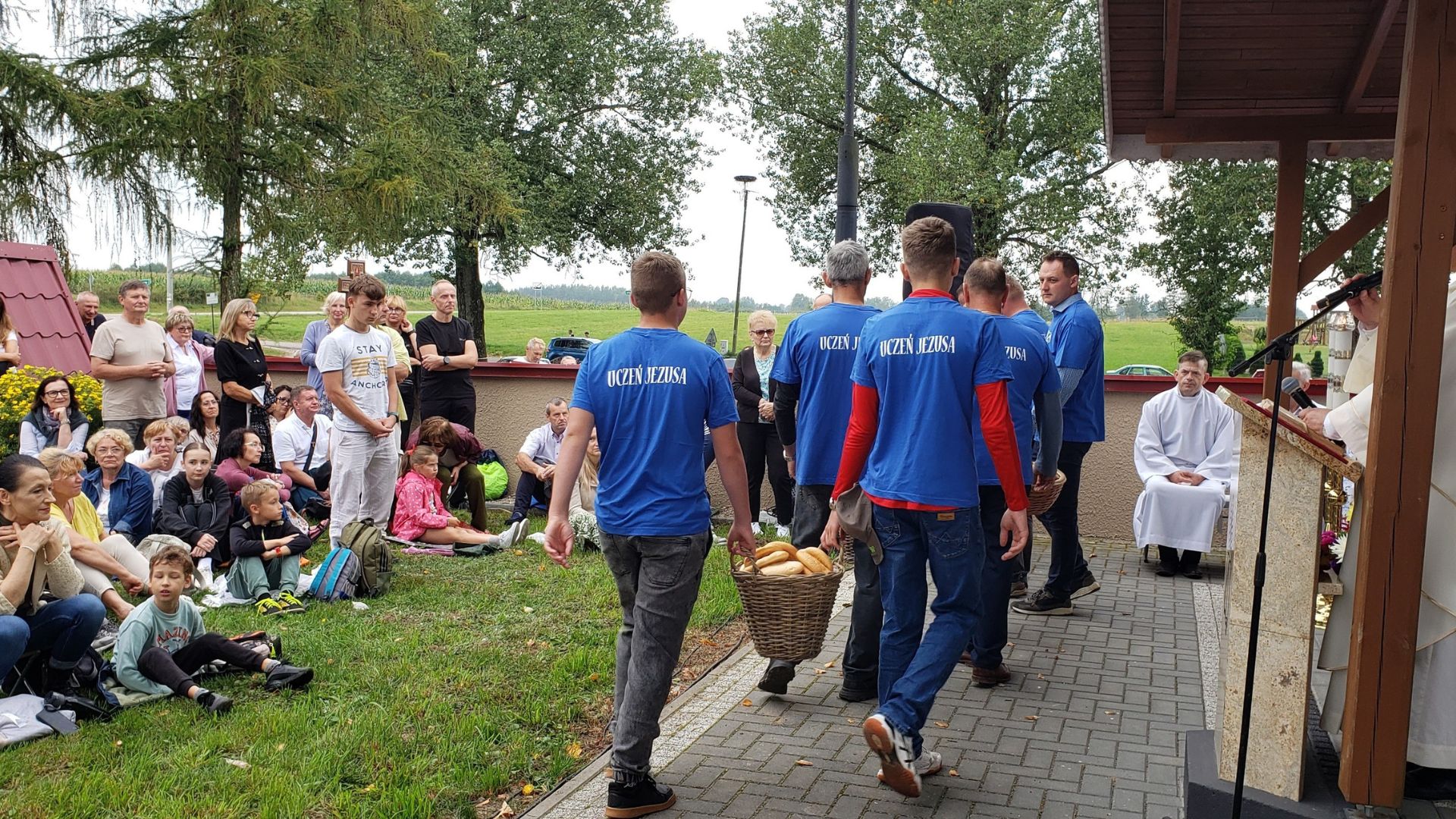 Szczególnie symboliczny był moment wniesienia przed ołtarz koszów z małymi chlebkami przez mężczyzn ubranych w koszulki z napisem „Uczeń Jezusa”. Gest ten przypomniał wszystkim o cudzie rozmnożenia chleba i zachęcił do dzielenia się sobą i swoimi dobrami. Po Eucharystii chlebki zabraliśmy do naszych domów, by podzielić się nimi z bliskimi — jako znakiem miłości, troski i duchowej jedności.