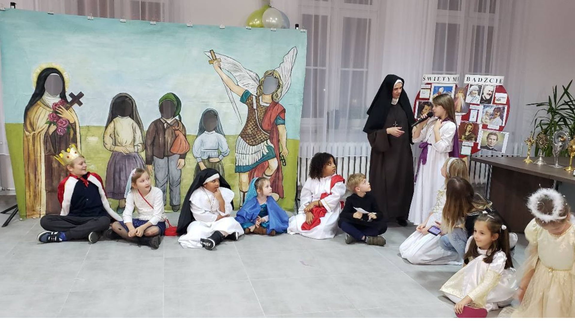 Wodzireje Grażyna i Marian Szejda poprowadzili pełen energii i uśmiechu program taneczny z licznymi zabawami integracyjnymi. W trakcie balu dzieci miały również okazję zaprezentować swoich świętych patronów, za których się przebrały, dzieląc się krótkimi opowieściami o ich życiu i świętości. Nie zabrakło także słodkiego poczęstunku oraz wyjątkowej atrakcji – budki fotograficznej ze świętymi, gdzie można było zrobić pamiątkowe zdjęcia.