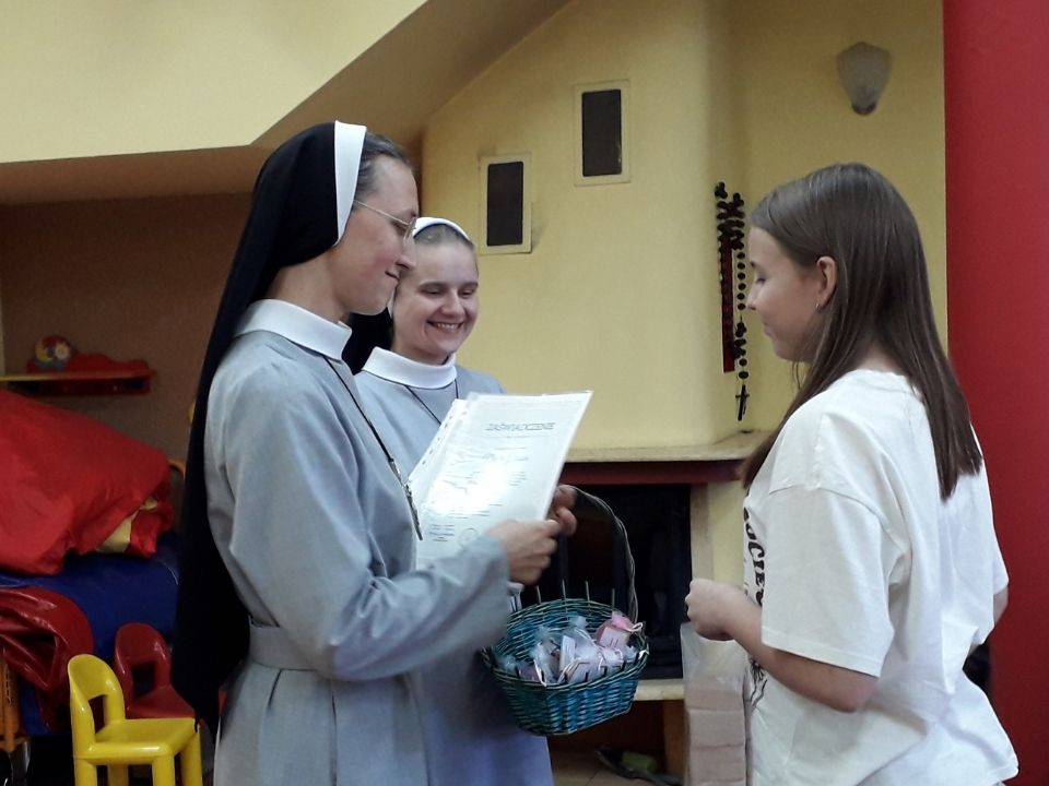 Po modlitwie udaliśmy się do sali świetlicowej, gdzie siostry Aneta Wagner i Krystyna Nowakowska w kilku słowach podsuwały czas wolontariatu i podziękowały za postawę służby i otwartości na drugiego człowieka. Następnie każdy z wolontariuszy otrzymał imienne zaświadczenie o wolontariacie oraz drobny upominek: sznurkowy różaniec wykonany przez nasze siostry nowicjuszki Olenę i Mariannę. Po tej części spotkania udaliśmy się do zakonnego refektarza, gdzie czekała na nas smaczna pizza i przepyszne ciasto upieczone specjalnie na tę okazję przez s. Mieczysławę Radzewicz. Po rekreacji wolontariusze udali się na swoje stanowiska pracy, aby tak jak zawsze przygotować kolejne warsztaty dla dzieci, które rozpoczynały się już następnego dnia rano.