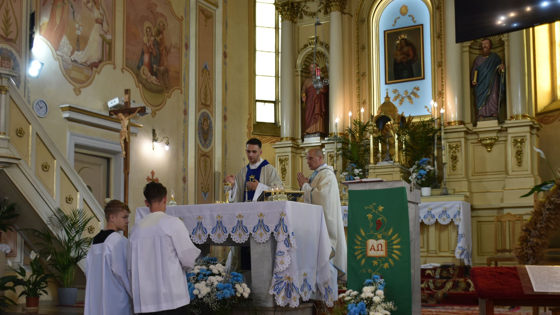 U progu świątyni w Kaletniku powitał nas i pobłogosławił ks. Arkadiusz Brozio, proboszcz parafii. W świątyni przybliżono nam historię parafii oraz cudownego obrazu Matki Bożej Pocieszenia. W homilii ks. proboszcz wyjaśnił, czym jest Boże pocieszenie. Zwrócił naszą uwagę na Maryję, pełną cnót, wybraną przez Boga na Matkę Zbawiciela, zawsze troszczącą się o nas i śpieszącą z pomocą. Podkreślił także rolę św. Józefa, jego postawę pełnego zawierzenia Bogu oraz stałego wsłuchiwania się w Jego głos.