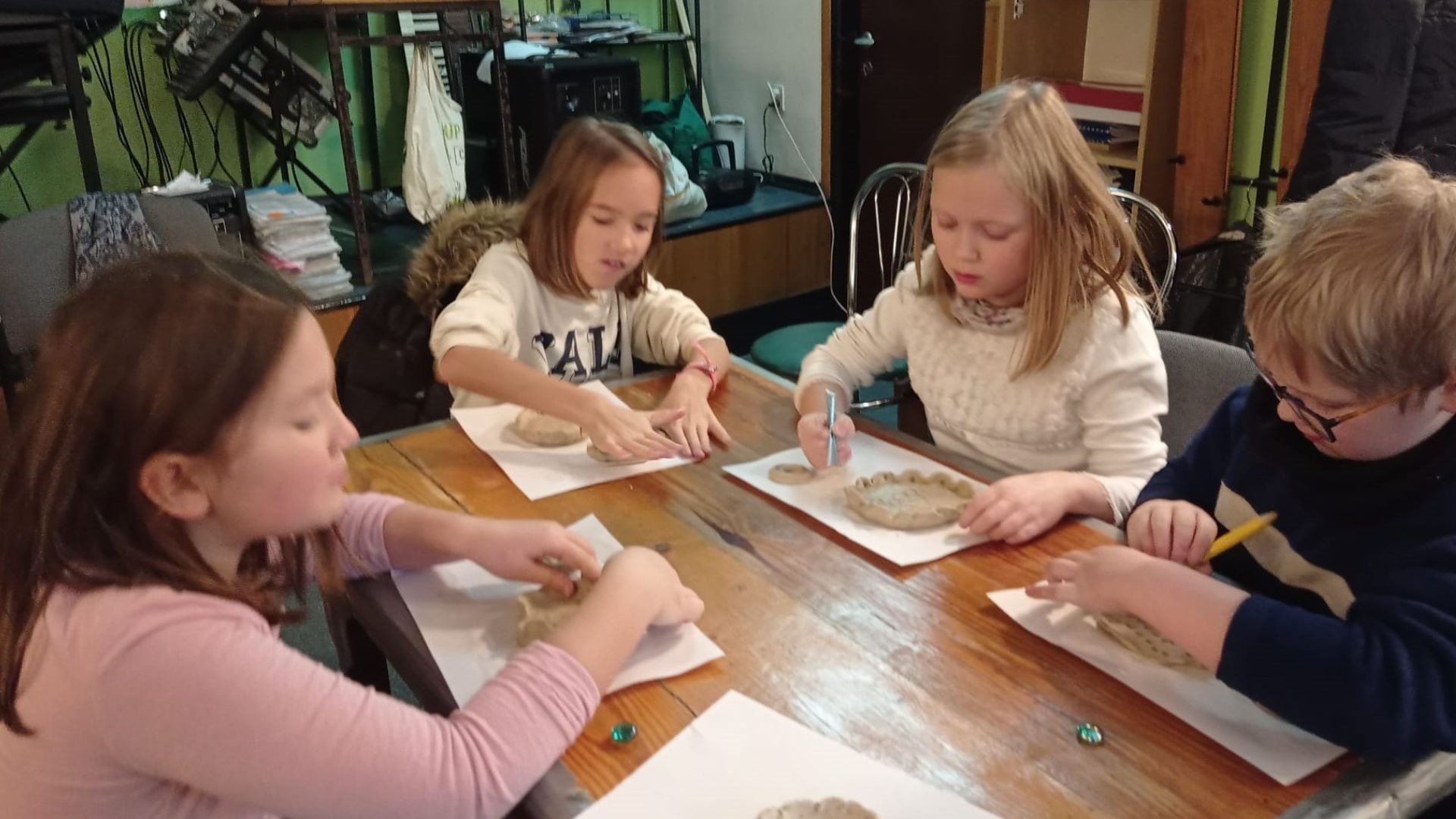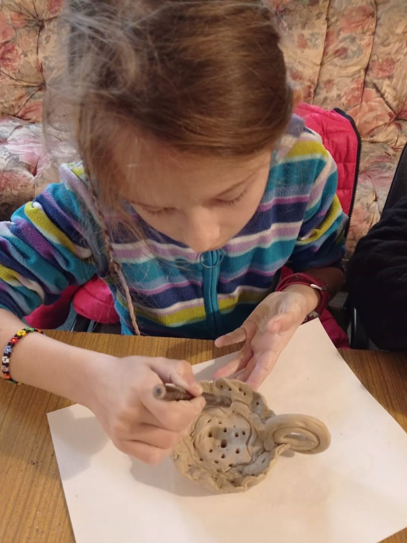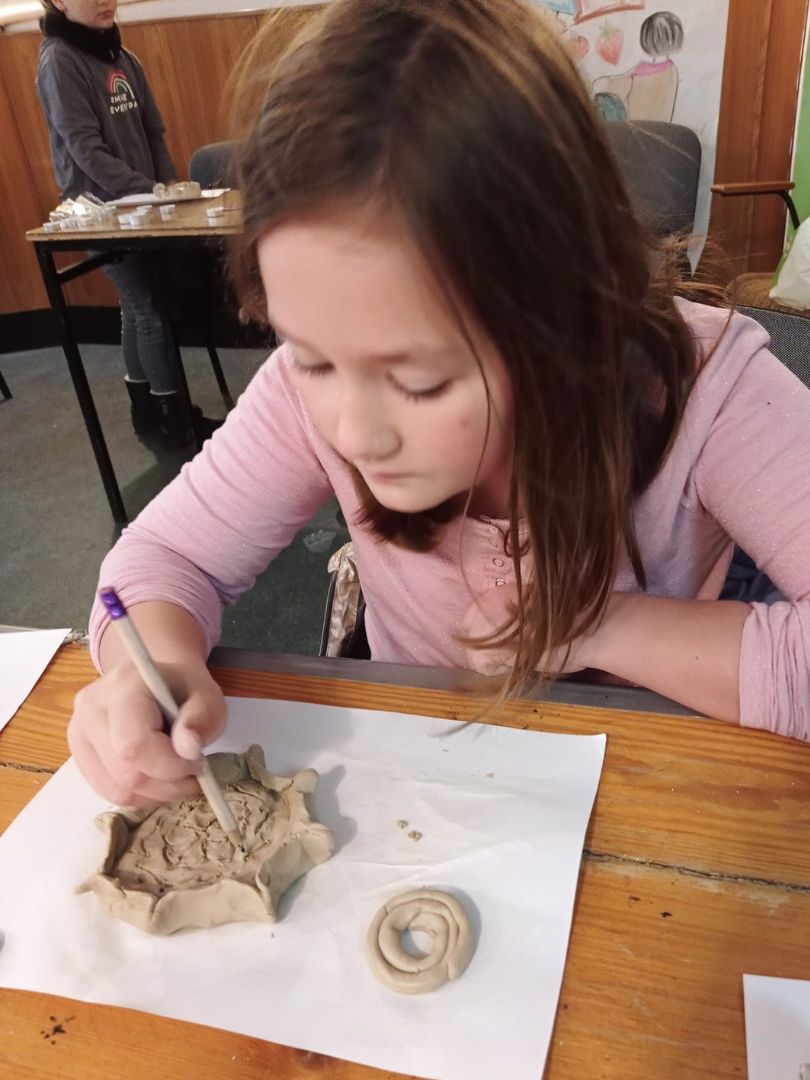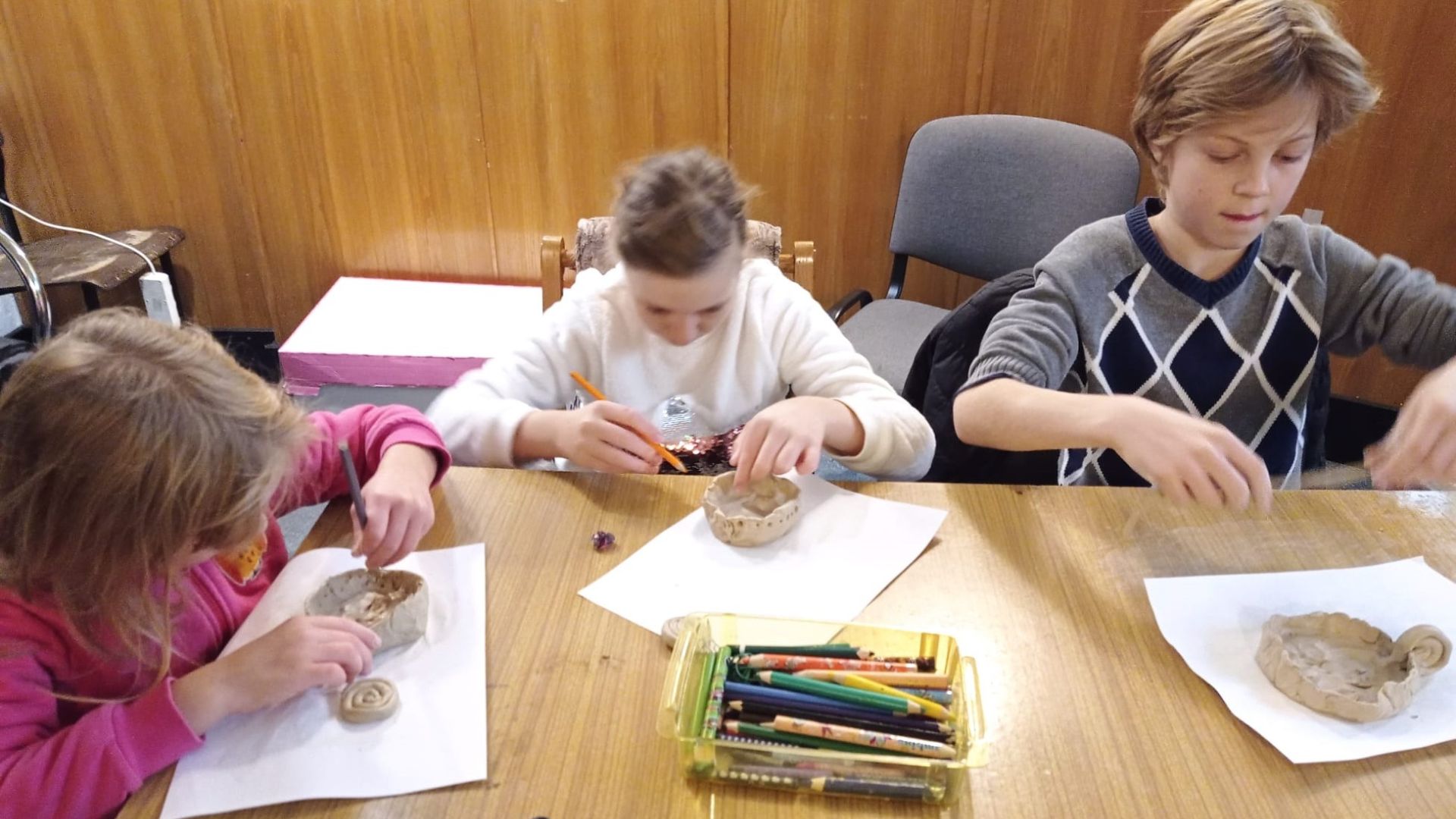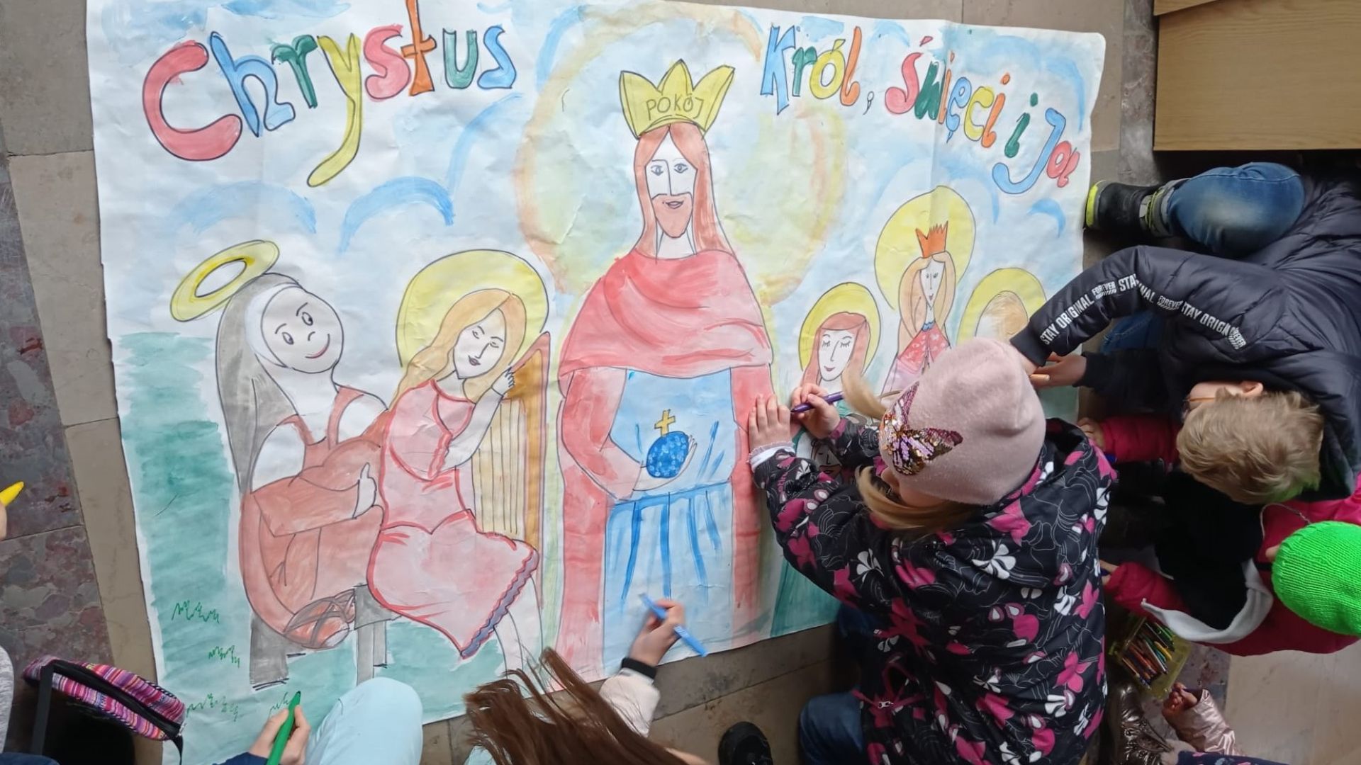 Na początku miały możliwość wykonania wspólnego plakatu o treści: Chrystus Król, Święci i ja. Podczas kolorowania prowadziły ze sobą rozmowy, opowiadały różne ciekawostki i kontemplowały treść plakatu. Potem był czas na opowiadanie, które tym razem zaczerpnęłam z książki Bruna Ferrero pt.: „Głos muszli”. Po podsumowaniu i wyciągnięciu wniosków, rozpoczęliśmy Adorację Najświętszego Sakramentu. Po błogosławieństwie zeszliśmy do sali, aby wykonać z gliny kaganek adwentowy. Na zakończenie zajadaliśmy się czekoladowymi mufinkami z zakonnej kuchni. Dodam tylko, że w międzyczasie szukaliśmy diamencików do Królewskiej korony, które zawieruszyły się gdzieś na alejkach kościoła.