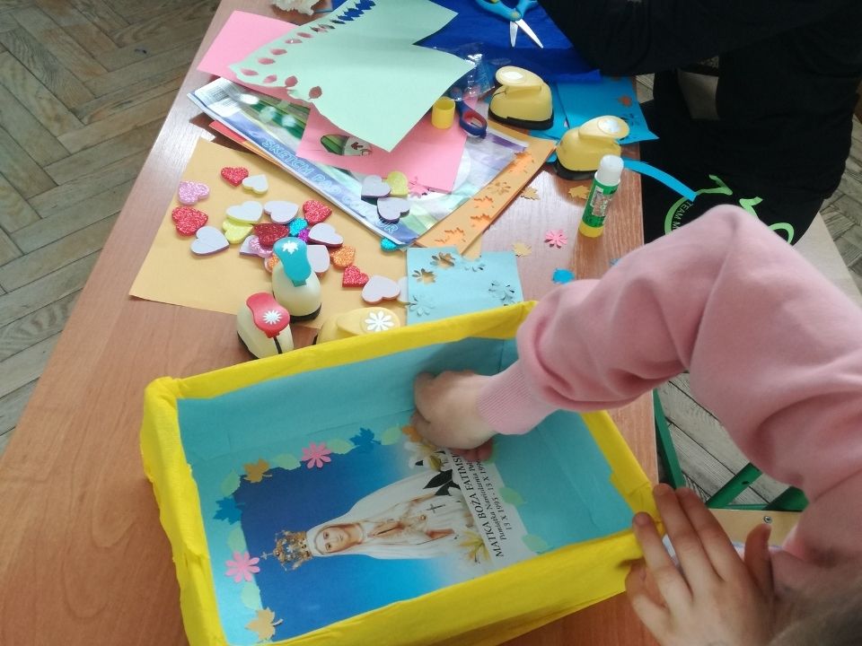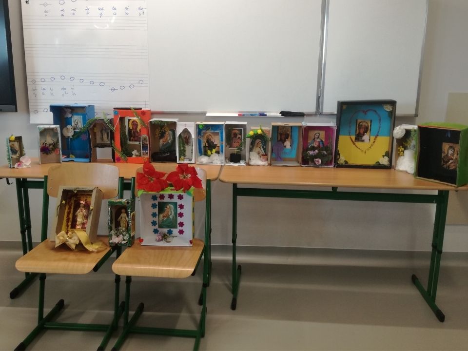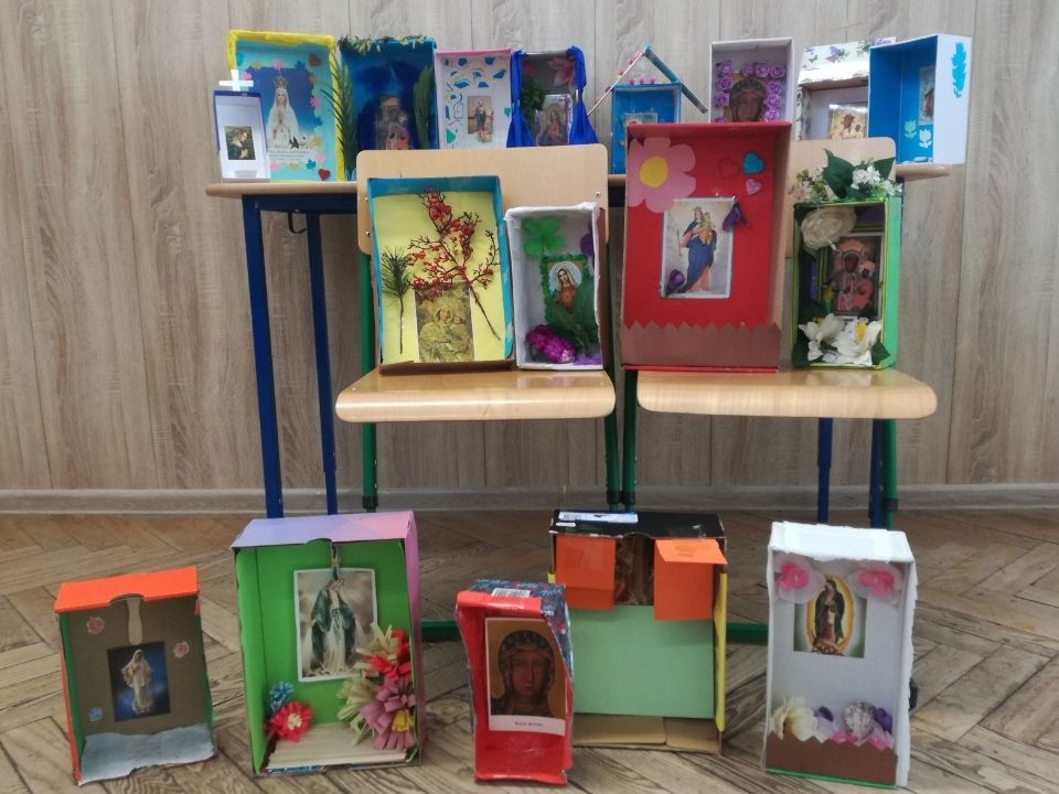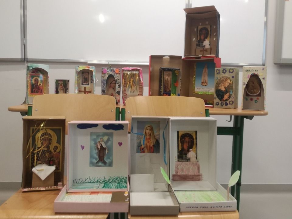 Rozmawialiśmy także o modlitwie jaką jest nabożeństwo majowe oraz o tradycji śpiewania litanii do Matki Bożej przy kapliczkach i w kościołach. Na kolejną lekcję każdy z uczniów miał za zadanie przynieść odpowiednie materiały z których wykonywaliśmy kapliczki dla Maryi. Uczestnicy zajęć projektowali i ozdabiali kapliczki według własnego pomysłu. Na koniec zrobiliśmy mini wystawę, a prace uczniów zostały uwiecznione na zdjęciach. Dzieci zabrały swoje prace do domu, z zachętą do postawienia kapliczki w widocznym miejscu oraz do modlitwy za wstawiennictwem Maryi, szczególnie w maju.