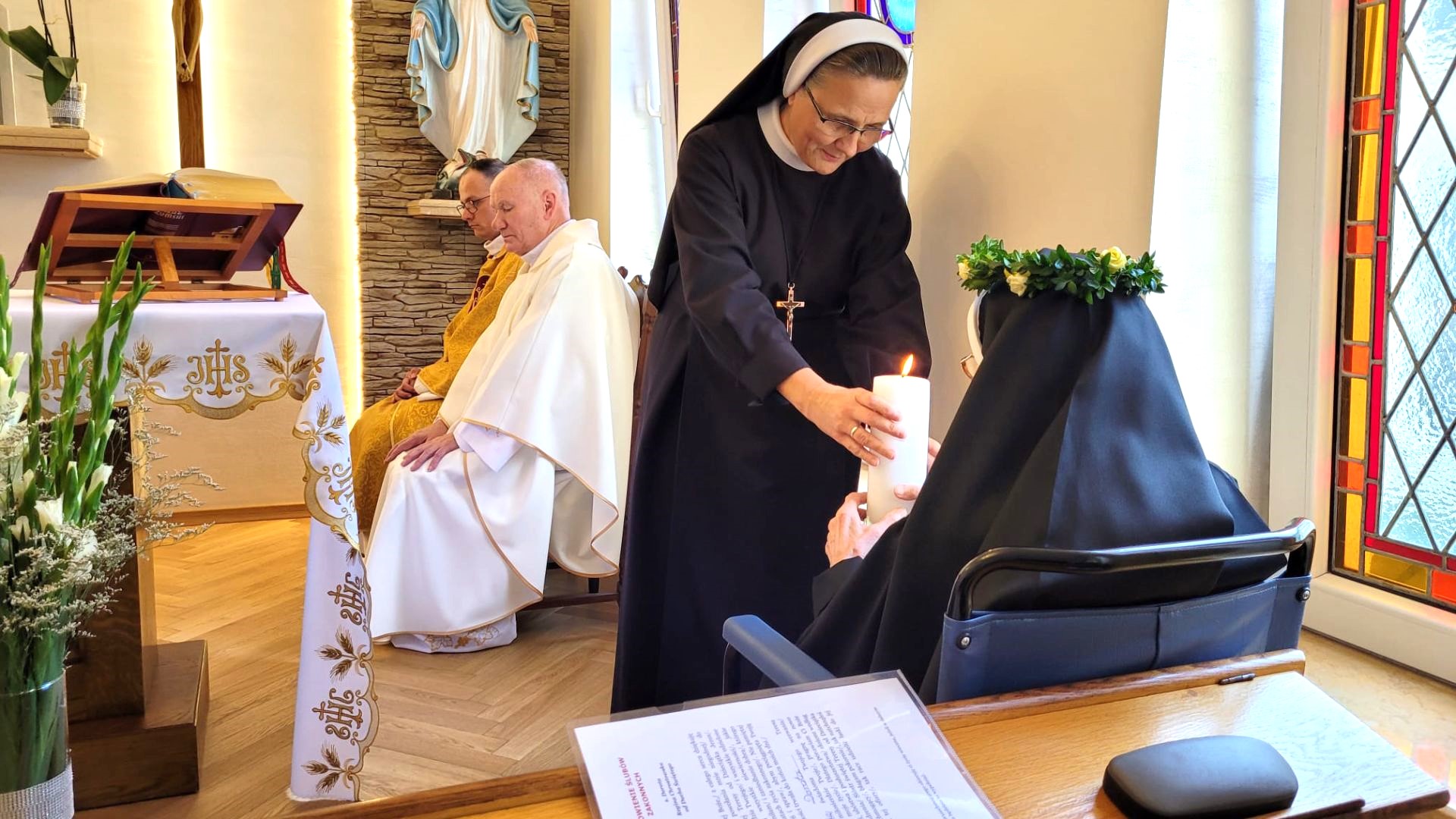 Msza Św. została odprawiona o godzinie 12-tej w naszej zakonnej kaplicy. Eucharystię celebrował ks. Sebastian Margiewicz, kazanie wygłosił ks. proboszcz Tadeusz Rynkiewicz. W homilii ksiądz proboszcz podkreślił wartość życia miłością w życiu zakonnym. Nawiązał do Księgi Ozeasza w której Bóg zaprasza nas do bliskiej relacji ze Sobą.