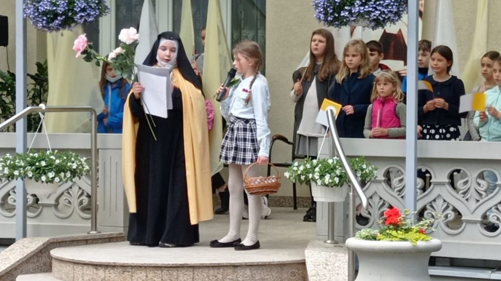 Aniela i Gabrysia wykonały przedstawienie. Rymowanka o małej drodze dziecka, które szuka relacji z Bogiem Ojcem zachwyciła wszystkich uczestników przenikliwością i bystrością dziecięcego serca oraz niezwykłą prostotą. Zaprezentowana treść w pełni oddała ducha małej drogi św. Teresy, którą podążają członkowie Misji.