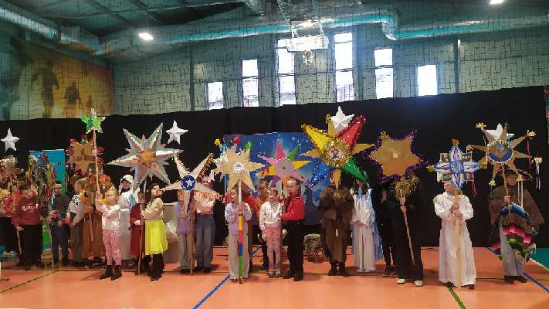 Po zakończeniu Mszy Świętej wszyscy udaliśmy się do sali gimnastycznej przy parafii księży salezjanów, gdzie kontynuowano dalszą część spotkania. Ks. biskup ponownie skierował słowo do wszystkich uczestników. Wyraził wdzięczność za to pierwsze w historii diecezji ełckiej Spotkanie Kolędników Misyjnych, przypadające w Roku Jubileuszowym i trwającym Kongresie Eucharystycznym. Następnie dzieliliśmy się opłatkiem i z zaciekawieniem obejrzeliśmy jasełka, zaprezentowane przez kolędników misyjnych z parafii pw. św. Tomasza w Ełku. Następnie odbyło się rozstrzygnięcie konkursu na najpiękniejszą gwiazdę kolędniczą.