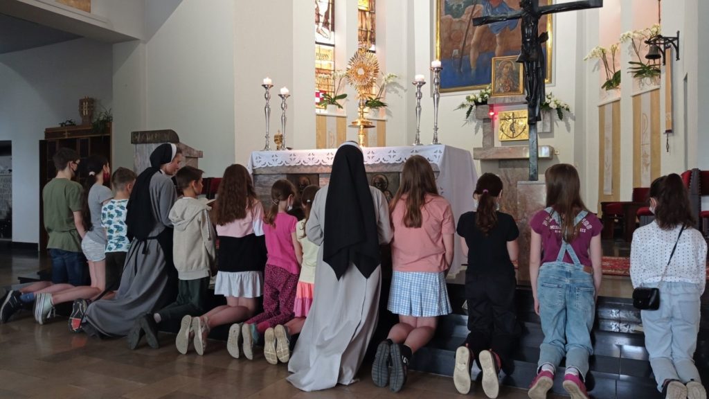 Dzieci z Podkowy Leśnej należące do Misji św. Teresy, w miesiącu czerwcu powierzały siebie Sercu Pana Jezusa. Dobrze jest przebywać przy Kimś wiedząc o tym, że nas kocha. Podczas Adoracji Najświętszego Sakramentu modliły się w intencji kapłanów o ich świętość i odwagę w dawaniu świadectwa. W dalszej części spotkania chętnie wysłuchały bajki, autorstwa księdza Ludwika Nowakowskiego, pt.: „Zwykły chleb”. Dla podkreślenia formacyjnego charakteru spotkania, wykonały wspólnie plakat, a w części kończącej spotkanie nie zabrakło też lodów, które zawsze sprawiają dzieciom wiele radości.