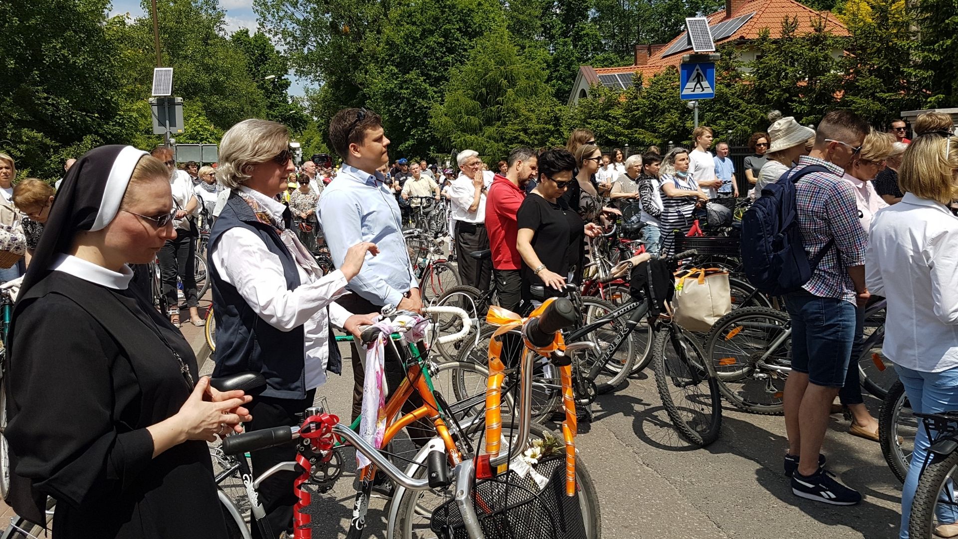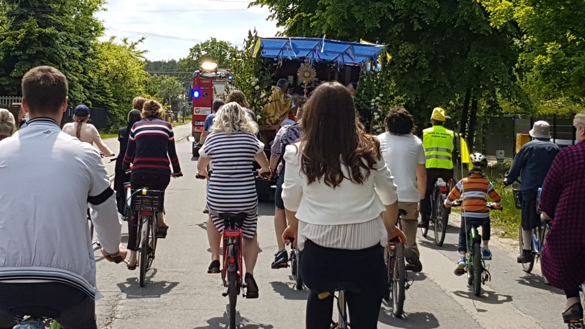 Po uroczystej Mszy św. kapłan z Najświętszym Sakramentem udał się do samochodu – kaplicy, który wcześniej został udekorowany kwiatami i zielenią. Samochód z Najświętszym Sakramentem skierował się na ul. Jana Pawła II w kierunku Żółwina. Za samochodem ruszył wielobarwny korowód rowerzystów, którzy przy dźwiękach eucharystycznych pieśni w umiarkowanym tempie zmierzali do pierwszego ołtarzyka na rozdrożu ulic: Kasztanowej i Łąkowej. Tam wierni wysłuchali Ewangelii i krótkiej homilii. Następny ołtarzyk był przy ul. Słonecznej gdzie zgromadził się lud wiernych z pobliskich domów, aby uczcić Jezusa Eucharystycznego. Przy pięknych promieniach słońca „mobilna procesja” ruszyła w stronę Owczarni, gdzie wszyscy wysłuchali trzeciej Ewangelii przy kapliczce na rozdrożu ulic: Książenickiej i Kazimierzowskiej. Czwarty ołtarz był przy Matce Bożej tzw. kamieniu węgielnym Podkowy Leśnej na skwerze księdza Bronisława Kolasińskiego.