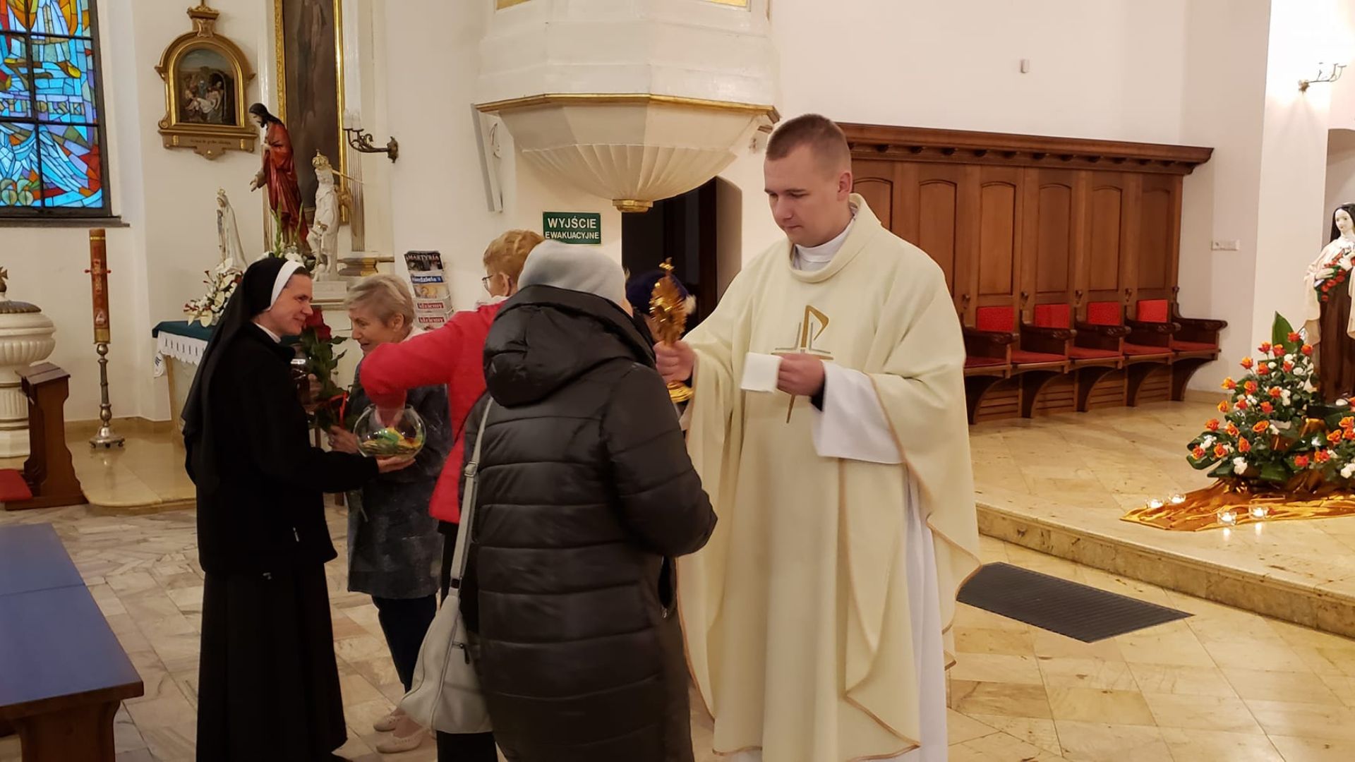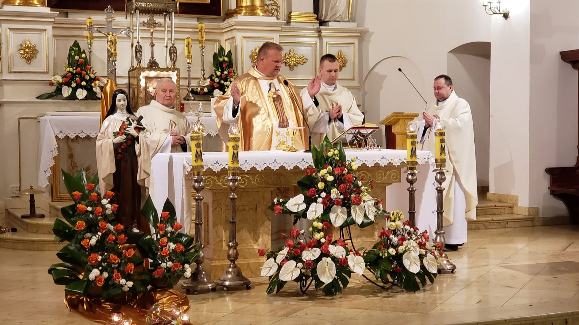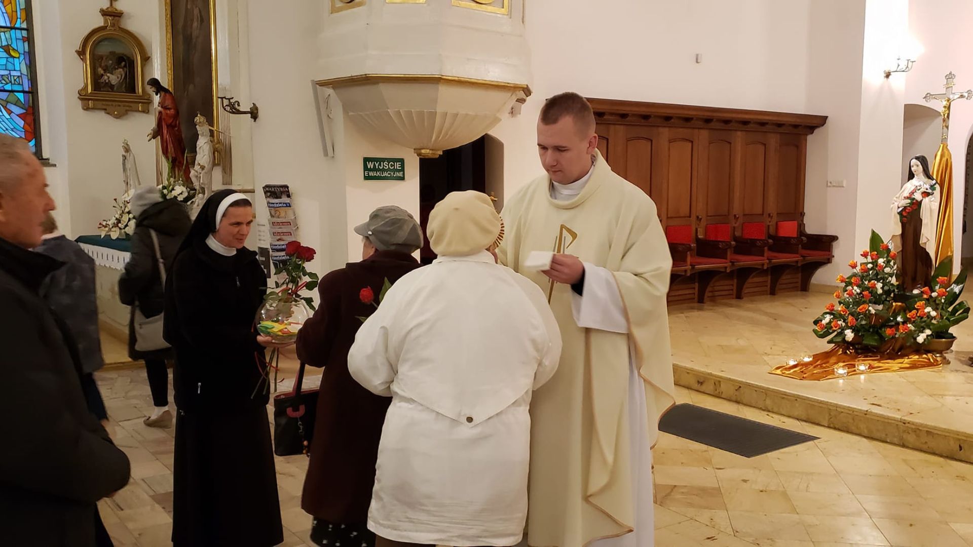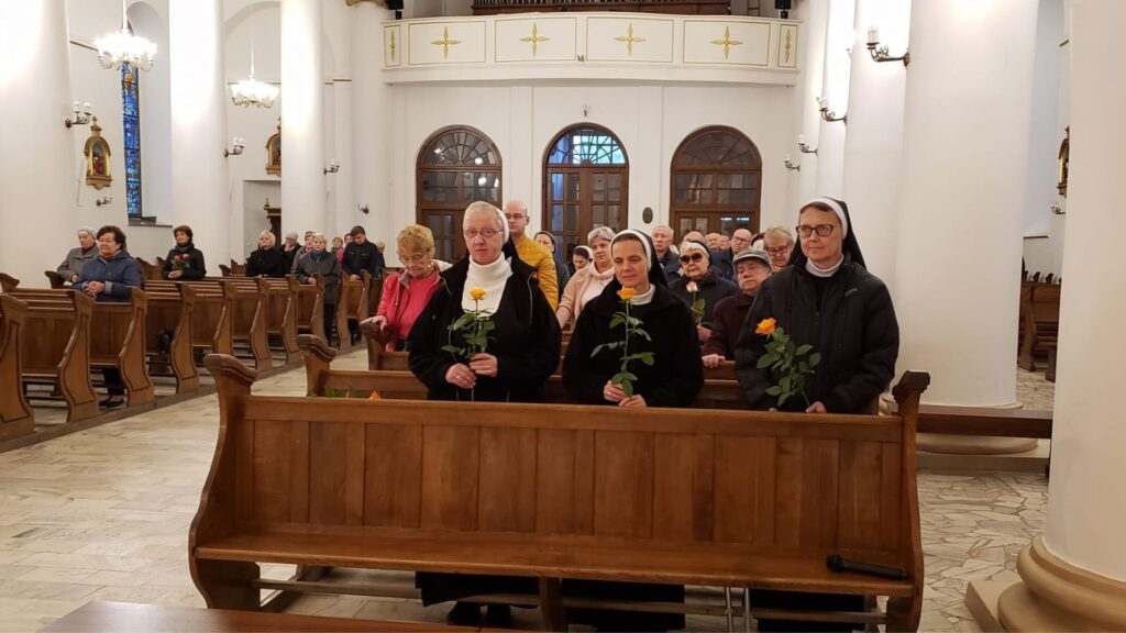 1 października, w Uroczystość św. Teresy do Dzieciątka Jezus, w kościele parafialnym uczestniczyłyśmy we Mszy świętej w intencji naszego Zgromadzenia. Oprawę liturgiczną prowadziły siostry wraz ze Wspólnotą Żywego Różańca i Rodziną Szkaplerzną. Ksiądz proboszcz Antoni Skowroński na zakończenie Mszy św. złożył siostrom życzenia, zaś przedstawiciele wspólnoty parafialnej ofiarowali róże i drobne upominki, za które serdecznie dziękujemy. Miało miejsce również uroczyste poświęcenie róż, ucałowanie relikwii i wręczenie myśli św. Teresy naszym parafianom.