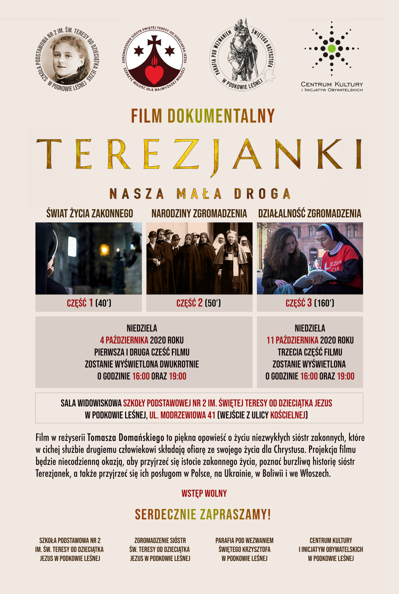 Projekcja filmu będzie niecodzienną okazją, aby przyjrzeć się codziennemu życiu oraz apostolskim posługom, jakie siostry Terezjanki realizują w Polsce, na Ukrainie, w Boliwii i we Włoszech. Pokaz został zorganizowany we współpracy Zgromadzenia Sióstr Świętej Teresy od Dzieciątka Jezus, Parafii pw. Świętego Krzysztofa w Podkowie Leśnej, katolickiej Szkoły Podstawowej Nr 2 im. świętej Teresy od Dzieciątka Jezus w Podkowie Leśnej oraz Centrum Kultury i Inicjatyw Obywatelskich w Podkowie Leśnej. Za tą współpracę serdecznie dziękujemy.