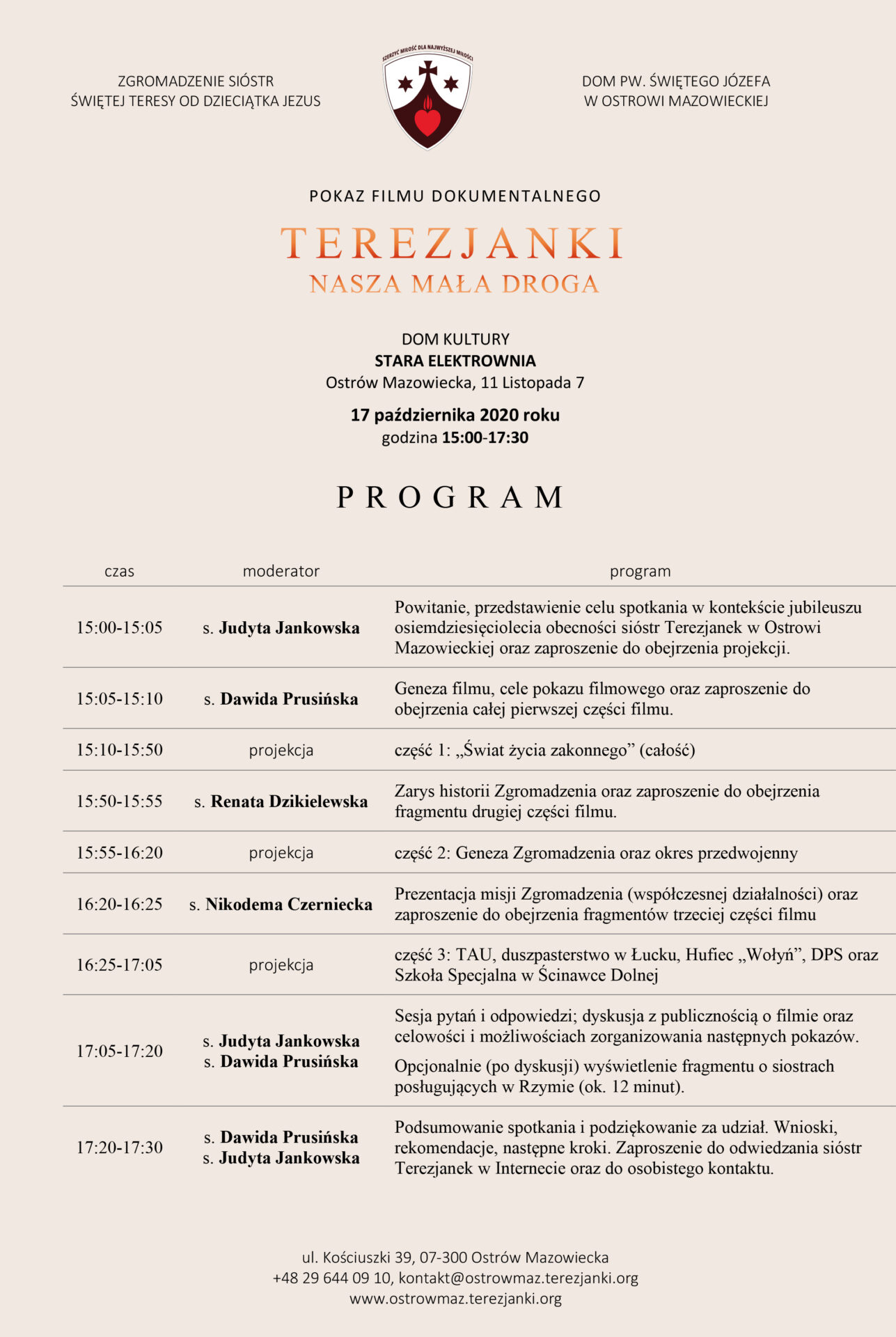 Dzięki organizacyjnej sprawności naszych ostrowskich sióstr – w szczególności sióstr Judyty Jankowskiej i Nikodemy Czernieckiej, a także życzliwości władz miasta oraz dyrekcji Domu Kultury Stara Elektrownia, udało nam się zapewnić komfortowe i bezpieczne warunki do przeprowadzenia pokazu, zgodne z wymaganiami władz sanitarnych. Pokaz trwał około 2,5 godziny. Po zakończeniu projekcji filmu uczestnicy pokazu dzielili się swoimi wrażeniami i opiniami. Usłyszałyśmy wiele ciepłych słów dotyczących zarówno treści filmowego obrazu, jak i jego artystycznej formy. Dla większości osób była to niecodzienna możliwość bliższego poznania naszego zgromadzenia oraz lepszego zrozumienia znaczenia, jakie ma nasza obecność dla lokalnej społeczności. Prezentacja filmu o Zgromadzeniu Sióstr Świętej Teresy od Dzieciątka Jezus zbiegła się z jubileuszem 80. lat obecności sióstr Terezjanek w Ostrowi Mazowieckiej.