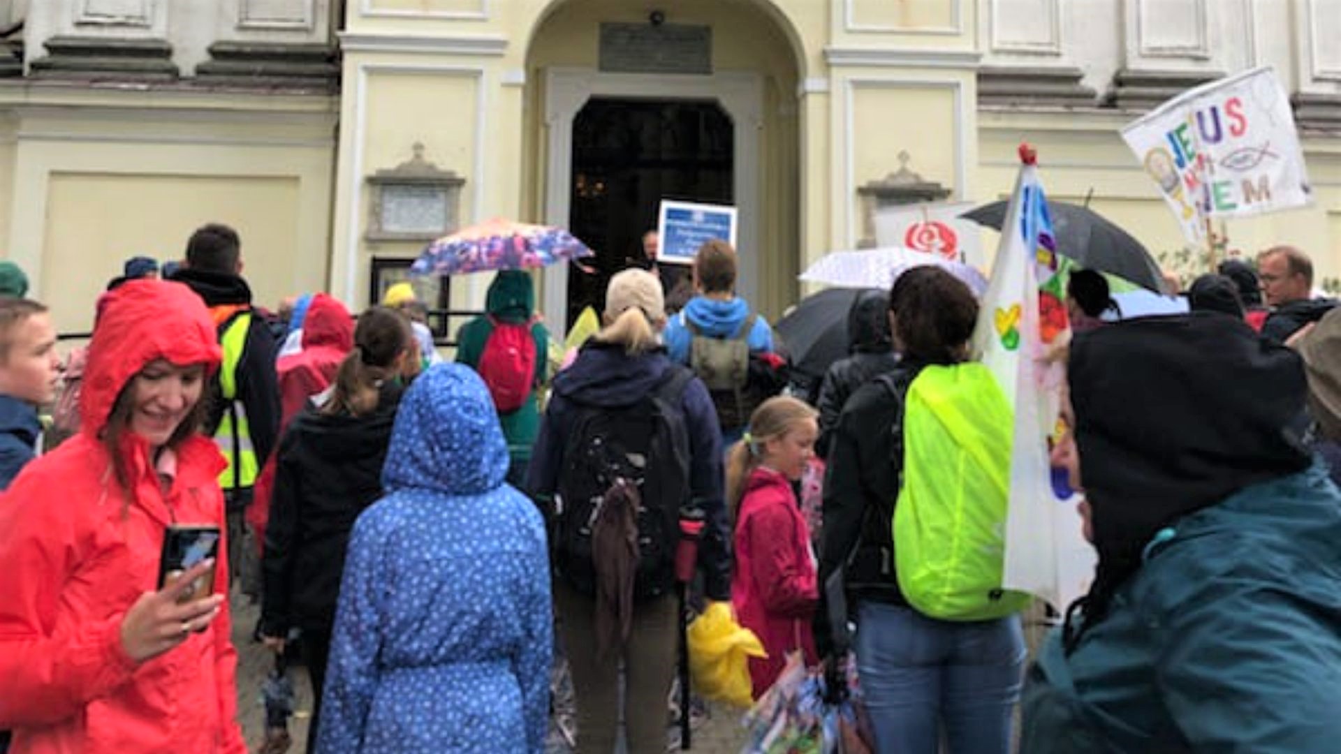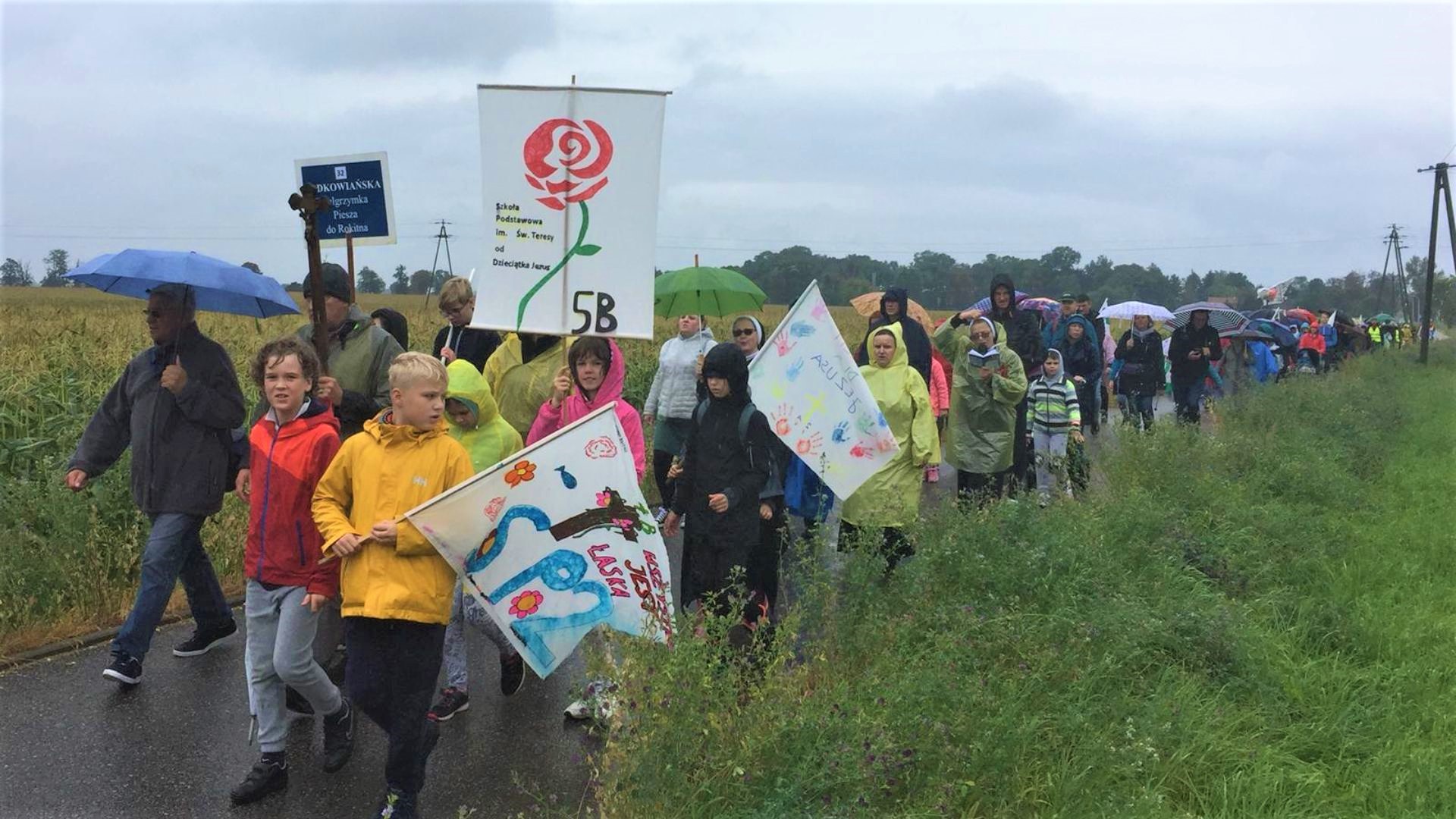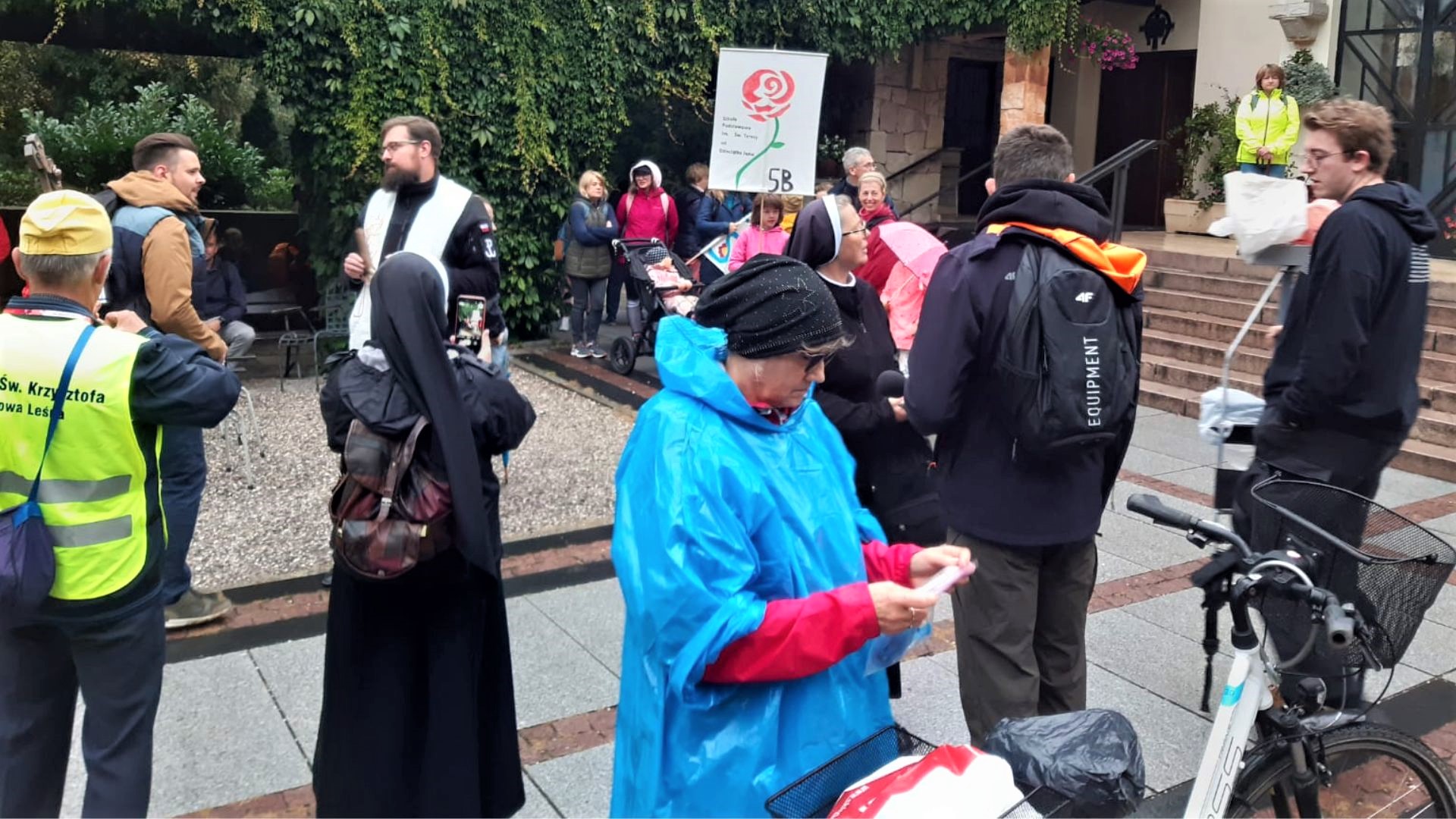 Pomimo tej niedogodności z pogodą pielgrzymowicze stawili się punktualnie o godz. 7.30 przy kościele. Było nas wszystkich 150 osób, oczywiście w tej różnowiekowej grupie nie zabrakło też dzieci i młodzieży. Były całe Rodziny, a także dzieci w wózeczkach. Uczniowie ze szkoły Katolickiej nieśli flagi reprezentujące poszczególne klasy, szły osoby, które w pielgrzymce uczestniczyły już po raz 20, ale były też i takie, które pielgrzymowały po raz pierwszy. Jedna z rodzin obchodziła w tym dniu 13-tą rocznicę ślubu. Tanti auguri. Były też Siostry Kalawerianki, które podzieliły się wiadomościami o swoim charyzmacie, a Siostra z Kenii zaśpiewała pieśń w swoim języku.