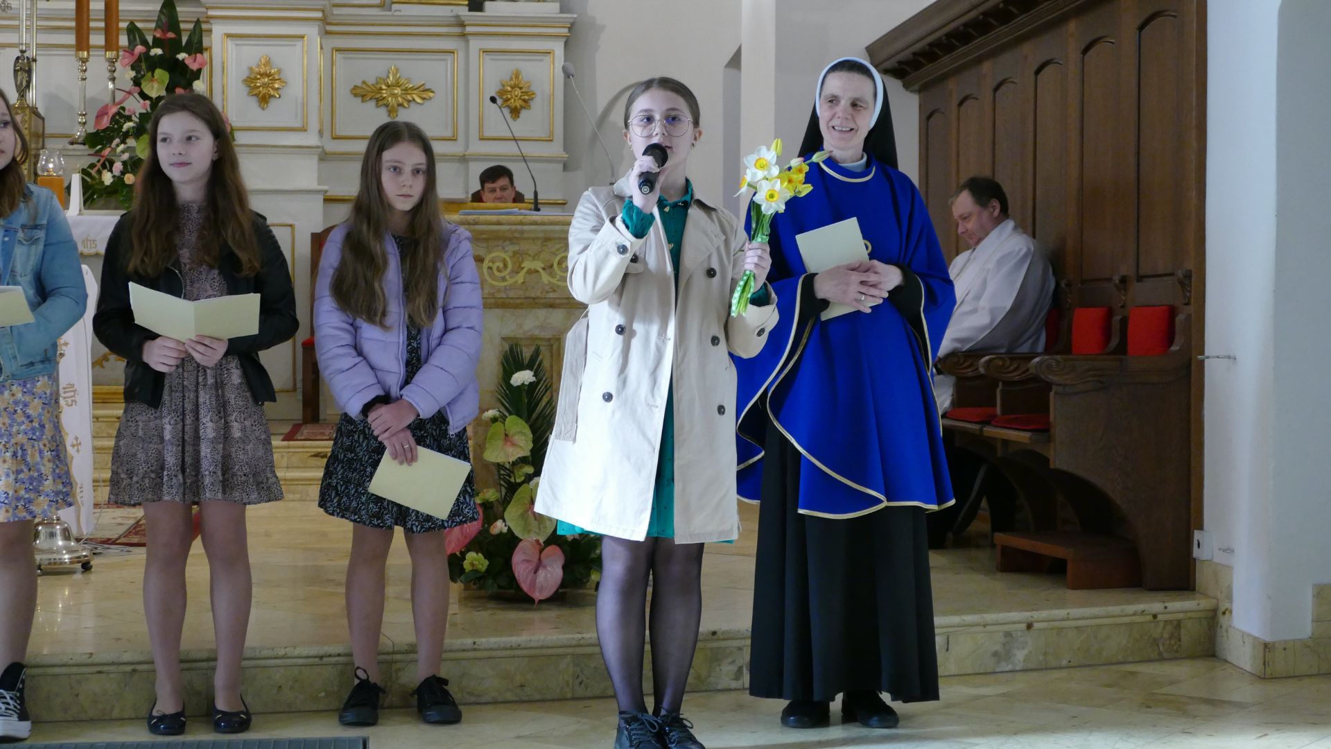 Na początku zaprosiliśmy naszych parafian do dziękczynienia Panu Bogu za dar chrztu Polski i uwielbiania Go za to, że nasza Ojczyzna jest potęgą chrześcijaństwa. Zachęciliśmy do wsłuchania się w dziecięce słowa opiewające radość Zmartwychwstania naszego Pana i Zbawiciela.