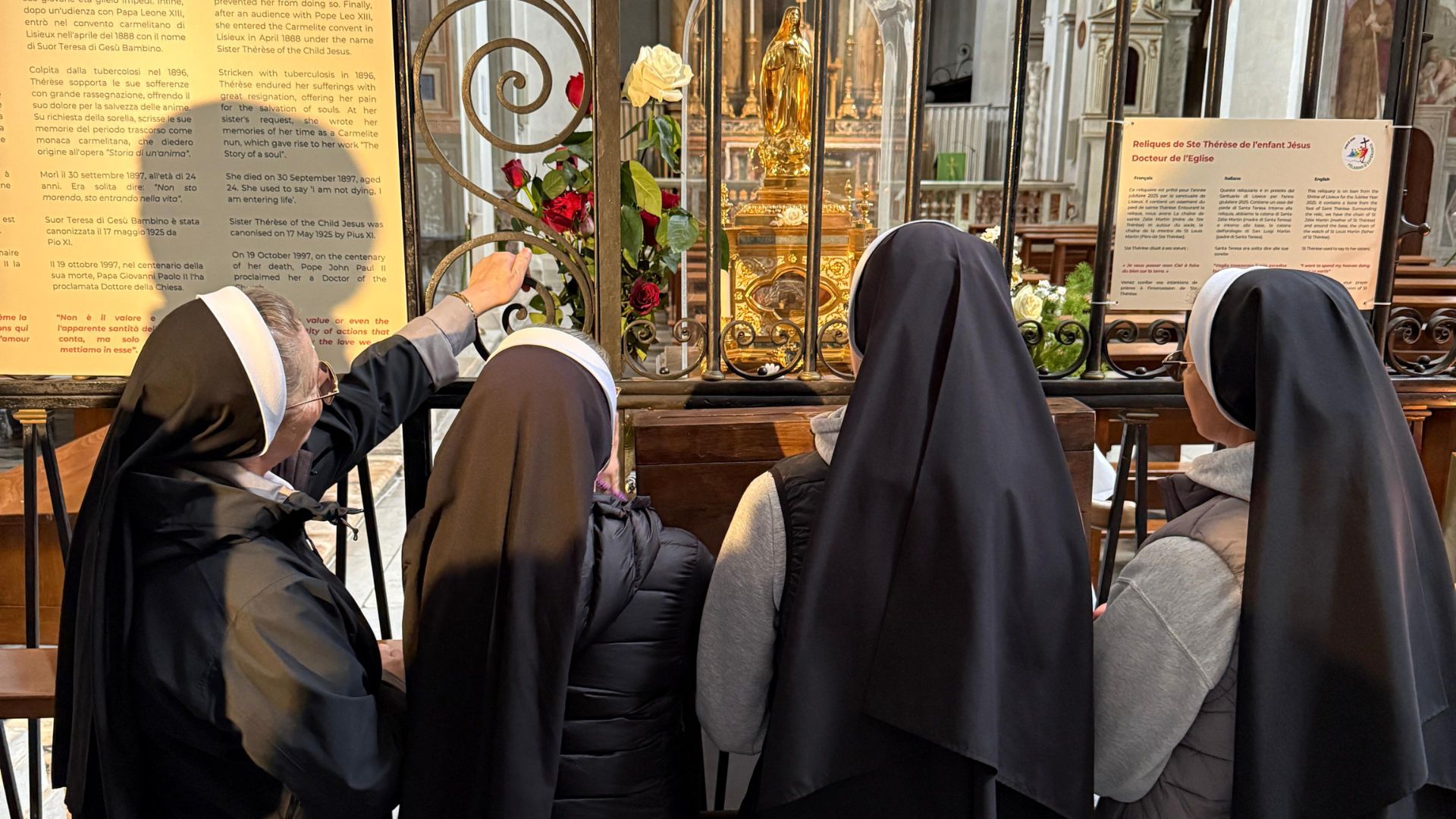 Powyższe słowa zmotywowały mnie do napisania kilku krótkich zdań o kościele Trinità dei Monti – Św. Trójcy na Górze w Rzymie, do którego przybyły relikwie św. Teresy z Lisieux na Rok Jubileuszowy 2025. Wcześniej już o tym wydarzeniu pisałam, jednak postanowiłam dodać krótkie uzupełnienie. Kościół ten należy do francuskiej fundacji z siedzibą we Włoszech i znajduje się pod opieka francuskiej ambasady. Zrzesza on pielgrzymów francuskojęzycznych. Zatem nic dziwnego że właśnie tu zostały umieszczone relikwie świętej z Lisieux. Odwiedzając to miejsce zauważyłam żywe zainteresowanie wokół jej relikwii. Odwiedzający piszą na karteczkach modlitwy i prośby i zostawiają je przy jej relikwiach. Dotarliśmy też na klasztorny dziedziniec z XVI wieku, na którym jest umieszczona ekspozycja zdjęć z życia św. Teresy. Zwykle to miejsce jest niedostępne dla odwiedzających kościół, nam udało się tam dostać dzięki życzliwości ojca Krzysztofa, pochodzącego z Francji. Z wielką radością obeszliśmy klasztorny dziedziniec podziwiając zdjęcia i średniowieczne freski na ścianach. Podczas rozmowy z Anią, która jak się okazało jest przewodniczką tego miejsca, dowiedziałyśmy się że Teresa właśnie z tego kościoła, udała się bezpośrednio na audiencje do papieża Leona XIII, by prosić go o wstąpienie w piętnastym roku życia do Karmelu.