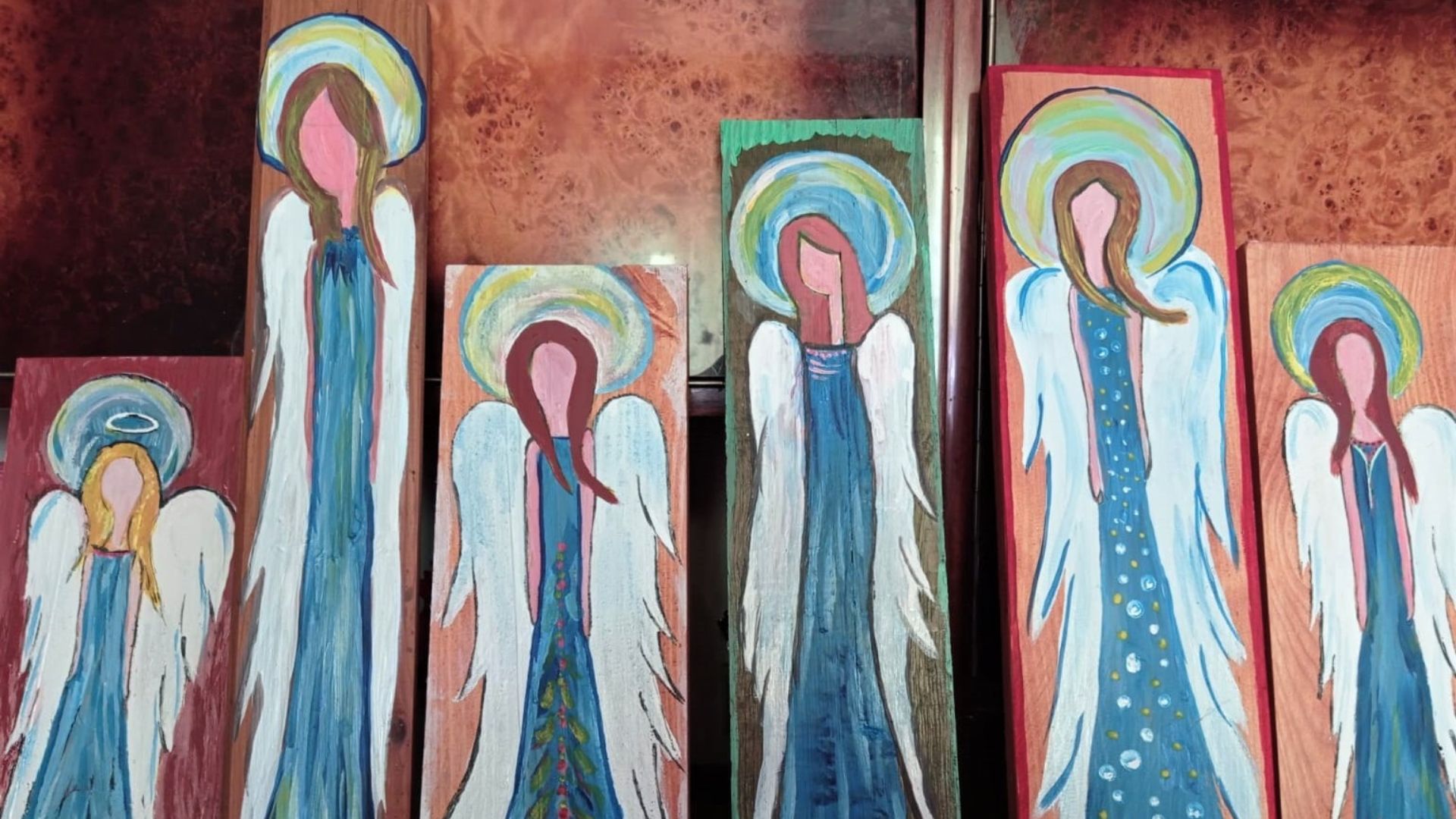 W mojej okolicy, pytani ludzie o stan ich samopoczucia często odpowiadają: „czuję się sielsko anielsko”, a to znaczy, że jestem szczęśliwy. Ja też tak się czułam w domu rodzinnym podczas dwutygodniowego urlopu. Wojciech Młynarski w piosence pt.: „Nie ma jak u mamy”, wyraził to najlepiej. Aby zobrazować swój „sielski, anielski nastrój” zabrałam się do malowania aniołów na desce. Warto zaznaczyć, że tematyka aniołów zawsze była mi bliska. W dzieciństwie malowała je moja mama. Te skrzydlate anioły adorujące Najświętszy Sakrament czy opiekujące się małym dzieckiem zawieszała nad naszymi łóżeczkami. Gdy dorastałam, kolekcjonowałam małe figurki aniołów: na szczęście, na pocieszenie, na zdrowie, na miłość, na radość… Gdy przychodził czas zmiany placówki, aby nie mnożyć bagażu, rozdawałam porcelanową kolekcję spotkanym dzieciom. W miarę upływu lat coraz chętniej poznawałam dzieła sztuki znanych malarzy ukazujących anioły, częściej sięgałam do nauki o Aniołach, która niezwykle jest mi przydatna na lekcjach religii. Pytania dzieci: skąd się wzięły anioły? kto ich stworzył?, czy diabeł jest aniołem? Dlaczego lucyfer odszedł od Pana Boga, gdy widział jak On jest dobry?, itp są wciąż aktualne. W zabytkowych kościołach lubię patrzeć na ścienne malowidła lub witraże przedstawiające sceny biblijne z aniołami. Gdy czytam tekst biblijny z księgi Wyjścia (23,20) „Tak mówi Pan: Oto Ja posyłam anioła przed tobą, aby cię strzegł w czasie twojej drogi i doprowadził cię do miejsca, które ci wyznaczyłem”, utwierdza mnie w tym, że Bóg dał mi swojego anioła, bym do Niego szczęśliwie wróciła.