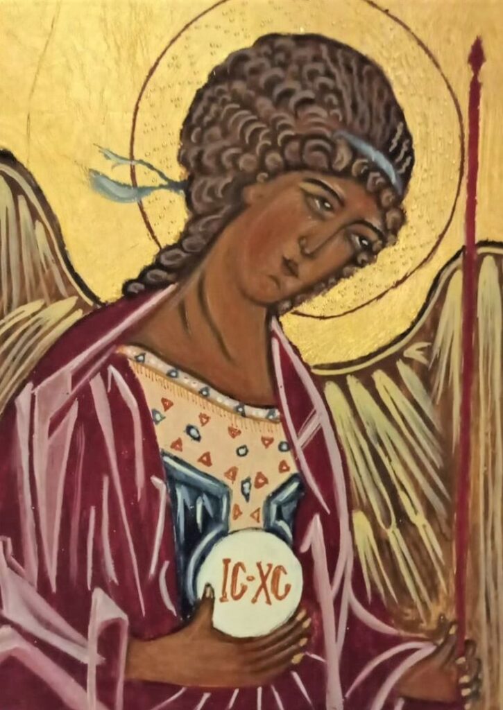 Z okazji zbliżającego się święta patronalnego jednej z naszych Sióstr postanowiłam napisać ikonę Archanioła Gabriela. W trakcie pisania podziwiałam Jego majestat, pokorę, dostojeństwo, mądrość i tajemnicę posłania. Wierzę, że zbliżające się Święto Archaniołów; Gabriela, Michała i Rafała oraz Aniołów Stróżów przymnoży nam wszystkim łaski wiary w świat Aniołów.