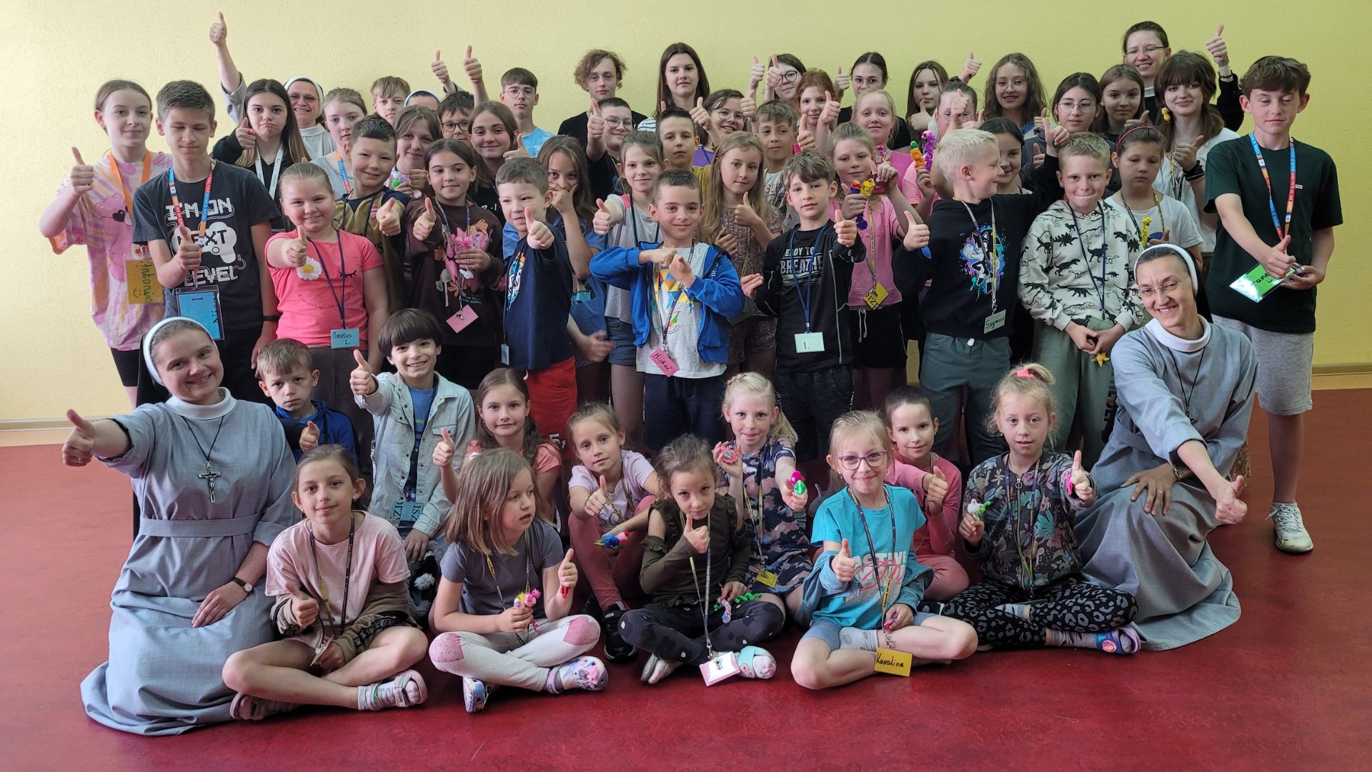 Na początku tradycyjnie wszyscy zostali serdecznie przywiani i przedstawieni: siostry, wolontariusze i uczestnicy. Tym razem mieliśmy radość gościć siostry z Ostrowi Mazowieckiej: s. Nikodemę Czerniecką i postulantkę Kamilę Cerkiewnik. Następnie uczestnicy zostali wprowadzeni w temat warsztatów i … rozpoczął się kreatywny czas. Dzieci pod troskliwym spojrzeniem sióstr i wolontariuszy miały do wykonania nakładki na długopisy oraz breloczki z filcu lub gąbki. W przerwie między tymi warsztatowymi zmaganiami zjedliśmy smaczne II śniadanie. Po zakończeniu warsztatu artystycznego i zrobieniu pamiątkowego zdjęcia rozpoczął się warsztat modlitwy tańcem, który poprowadziły s. Nikodema i postulantka Kamila. Siostry wprowadziły nas w ten czas piękną katechezą, a następnie uwielbialiśmy Pana Boga tańcem i śpiewem. Nauczyliśmy się także piosenki w języku ukraińskim, aby zaśpiewać ją dla dzieci z Ukrainy, jako naszą modlitwę za nich.