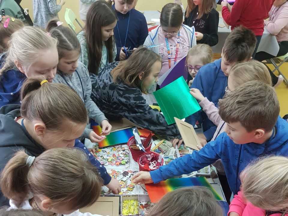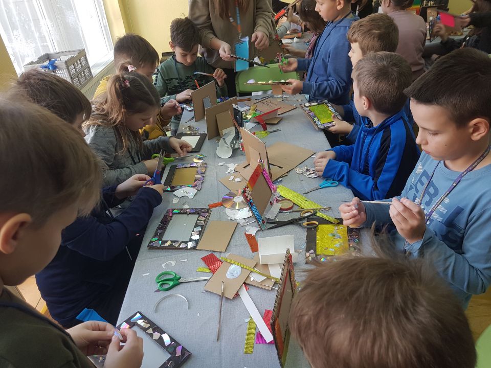 Następnego dnia od rana na dzieci z niecierpliwością czekały już siostry Terezjanki i wolontariusze. Tradycyjnie warsztaty odbyły się w Świetlicy im. Dzieciątka Jezus. Przed godziną 9 w recepcji pojawił się całkiem spory tłum – małych artystów przybyło ponad 50 osób. Po muzycznym przywitaniu i wprowadzeniu w temat dnia (towarzyszyła nam kolejna wskazówka na małej drodze do Jezusa – UFNOŚĆ) rozpoczęliśmy warsztatową część spotkania. Zadaniem dzieci było wykonanie dwóch ramek do zdjęć – jednej w formie mozaiki z wykorzystaniem starych płyt CD, a drugiej według własnego, autorskiego pomysłu. To był niezwykle kreatywny czas! W przerwie między dwiema częściami warsztatu artystycznego uczestnicy zjedli smaczne śniadanie.
