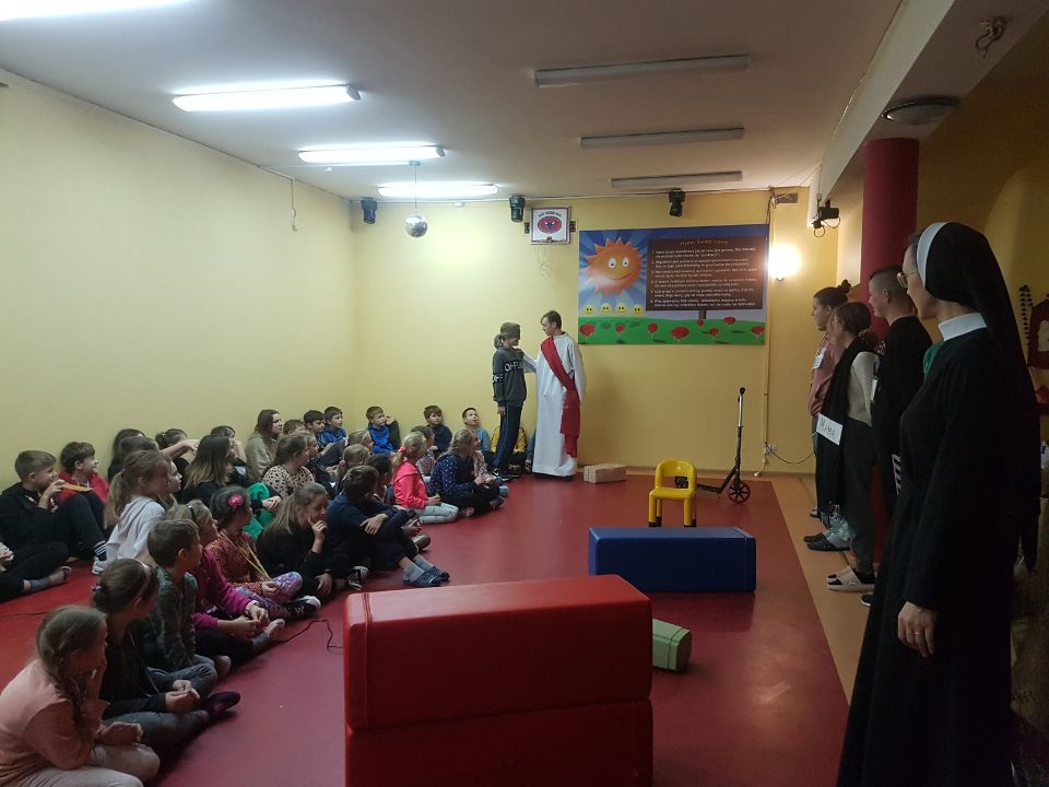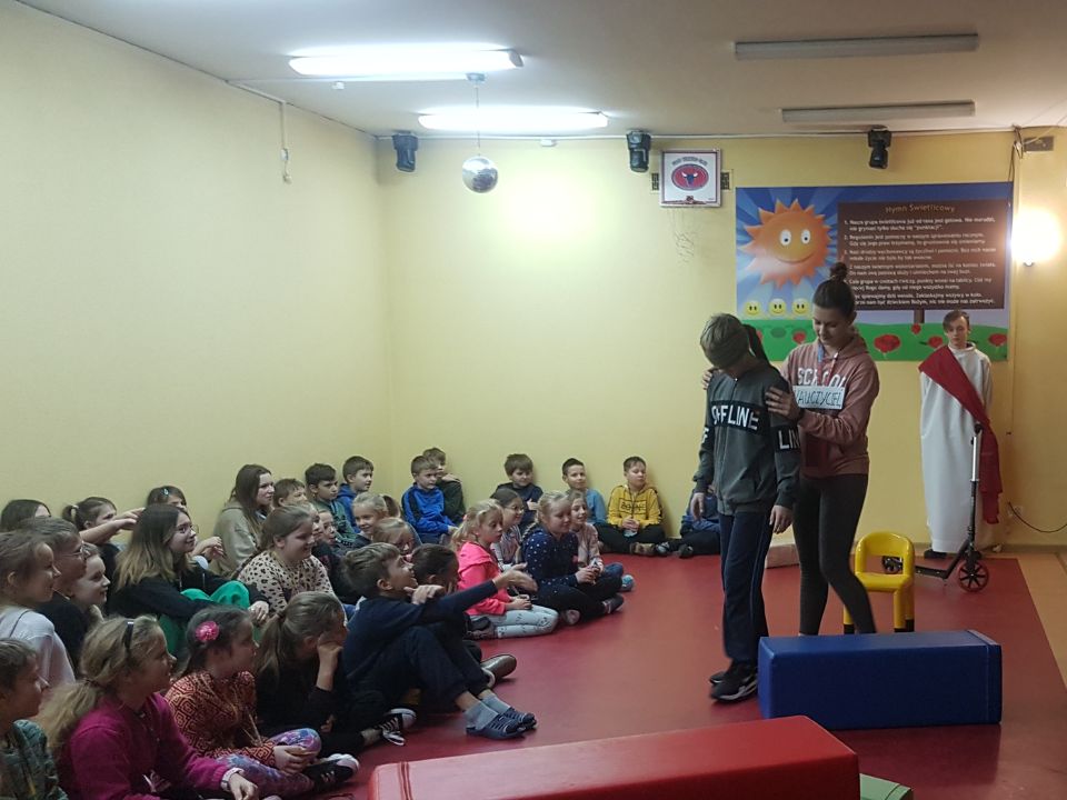 Po wykonaniu ramek rozpoczęła się część formacyjna spotkania. Poruszyliśmy temat zaufania, a siostra Krystyna przeczytała treść wskazówki o zaufaniu na małej drodze do nieba. Rozmawialiśmy też o tym, w jakich sytuacjach czujemy się niepewnie i odczuwamy lęk. Okazało się, że nie lubimy ciemności i samotności. W takich trudnych sytuacjach potrzebujemy kogoś, kto jest obok i komu możemy zaufać. Wspólnie rozwiązaliśmy zadanie z którego odczytaliśmy myśl św. Teresy: Ufność czyni cuda! Następnie z wielkim zainteresowaniem obejrzeliśmy pantomimę przygotowaną przez s. Anetę i wolontariuszy . Przypomniała nam ona o tym, że Jezus prowadzi nas przez swoje Słowo oraz przez innych ludzi: rodziców, nauczycieli, księdza i siostrę zakonną, a także przez przyjaciół. Zwieńczeniem tej części spotkania była wspólna modlitwa o dar zaufania Jezusowi dla każdego z nas.