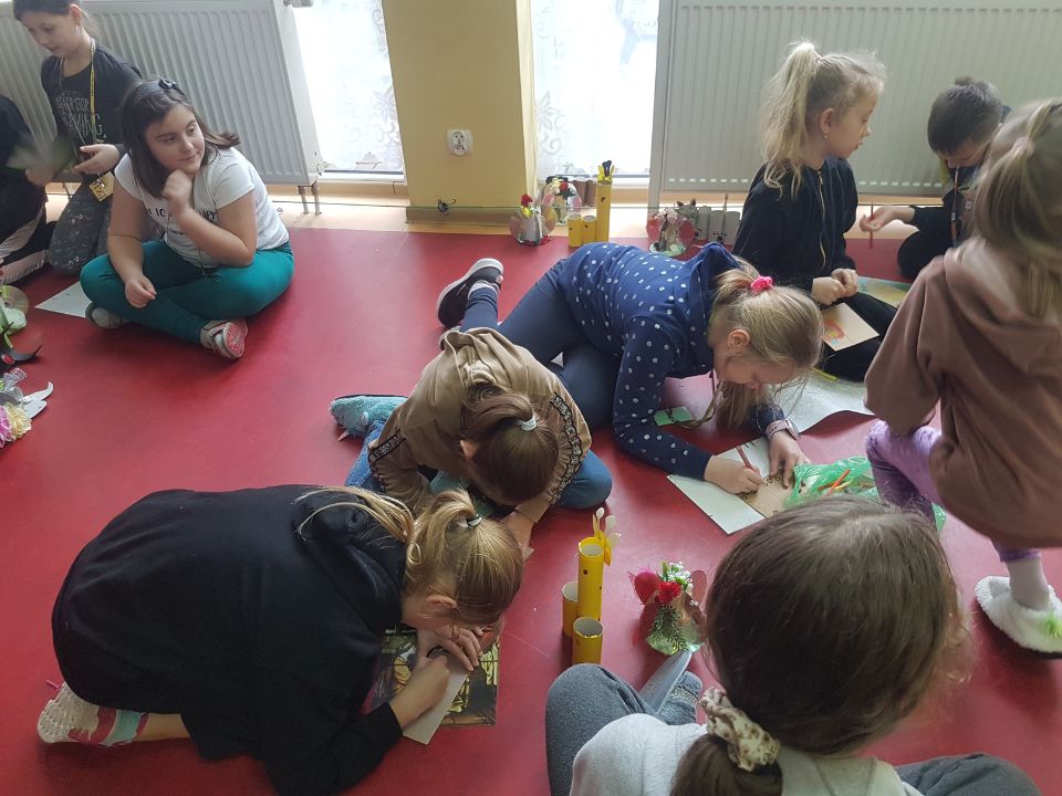 Następnego dnia, już od rana, z wielką radością na małych artystów czekały siostry i wolontariusze. Spotkanie tradycyjnie rozpoczęło się o godzinie 9:00 wspólną modlitwą i przedstawieniem się. Uczestnicy zostali podzieleni na pięć kolorowych grup, a wolontariusze i siostry jak zawsze z troską i zainteresowaniem czuwali nad swoimi podopiecznymi. Po przywitaniu rozpoczął się warsztat artystyczny. Myślę, że można spokojnie zaliczyć go do kategorii tzw. recycling art. W starych płyt CD oraz z rolek po papierze toaletowym wykonywaliśmy wazony oraz zwierzęta. Mimo, iż artystycznym zmaganiom została nadana jakaś linia, to wszystkie prace były wykonywane według autorskich pomysłów. Powstały wyjątkowe wazoniki oraz niezwykle kolorowe zwierzęta, co widać na załączonych zdjęciach.