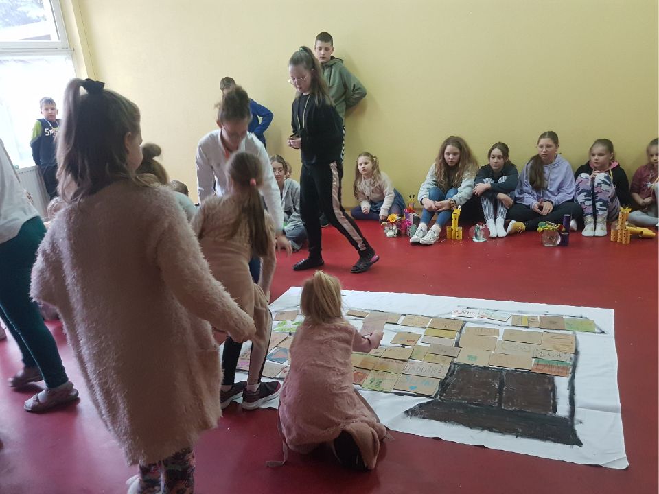 Po zakończeniu warsztatu artystycznego, sesji fotograficznej i względnym sprzątnięciu sali rozpoczął się czas zadania formacyjnego. Siostra Krystyna wprowadziła uczestników w temat budowania wspólnoty Kościoła. Przypomnieliśmy sobie, że każdy z nas jest taką wyjątkową i niepowtarzalną cegiełką, która buduje żywy Kościół. Na podłodze zostało rozłożone płótno z zarysem budynku kościoła, który dzień wcześniej wykonała jedna z wolontariuszek. Każdy z uczestników otrzymał kawałek kartonika, który miał symbolizować cegiełkę. Następnie pisaliśmy na nim swoje imię i kolorowaliśmy go tak, żeby przypominał naszą wizytówkę. Każda z grup miała za zadanie tak układać wykonane przez siebie cegiełki, aby wypełnić nimi ściany narysowanego na płótnie kościoła. Po wykonaniu zadania wszyscy zauważyli, jak oryginalny i kolorowy powstał budynek. Tak właśnie wygląda wspólnota Kościoła budowana przez nas – każdy jest potrzebny i każdy wnosi do niej swój niepowtarzalny wkład.