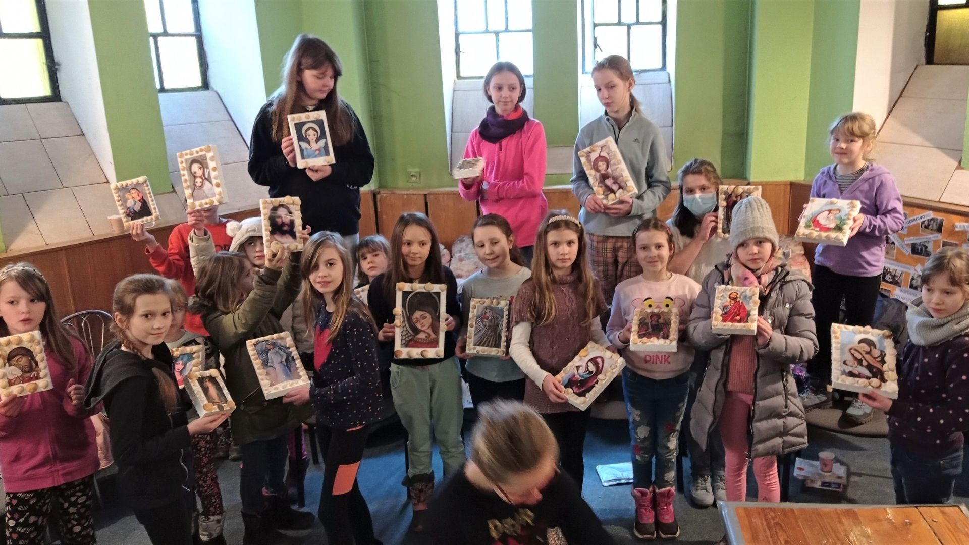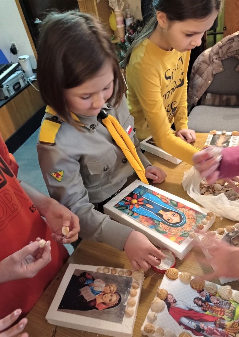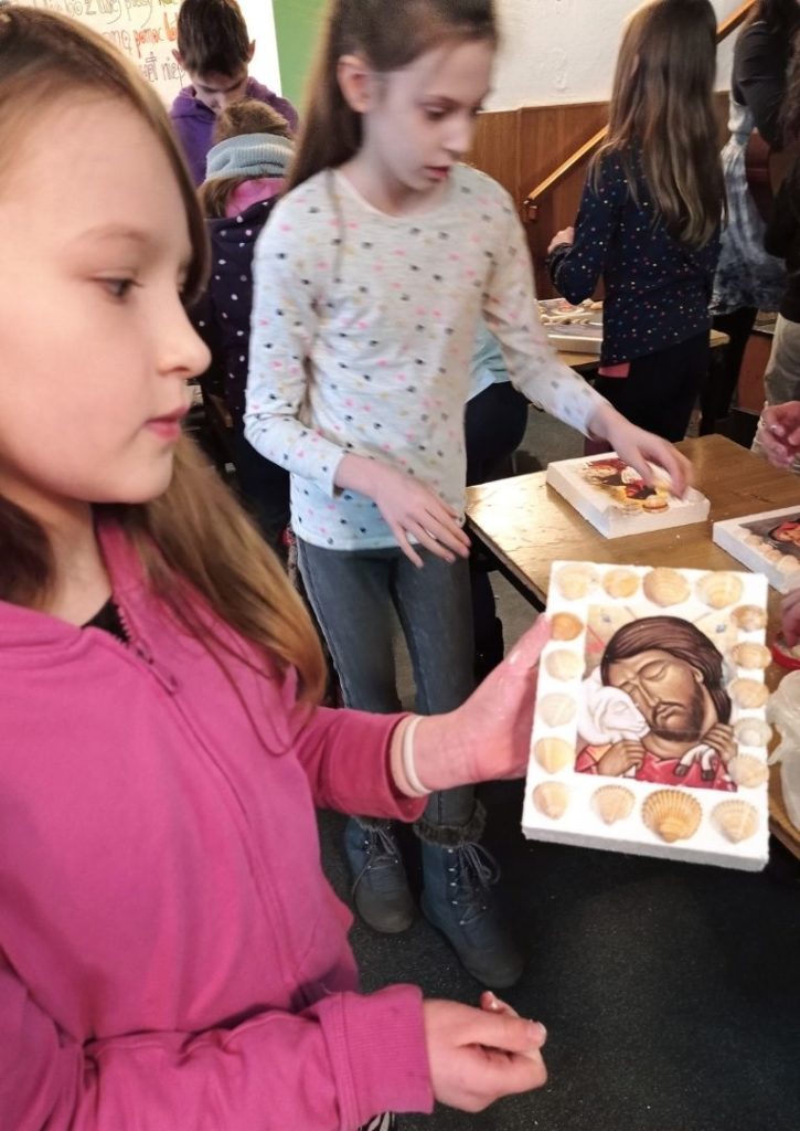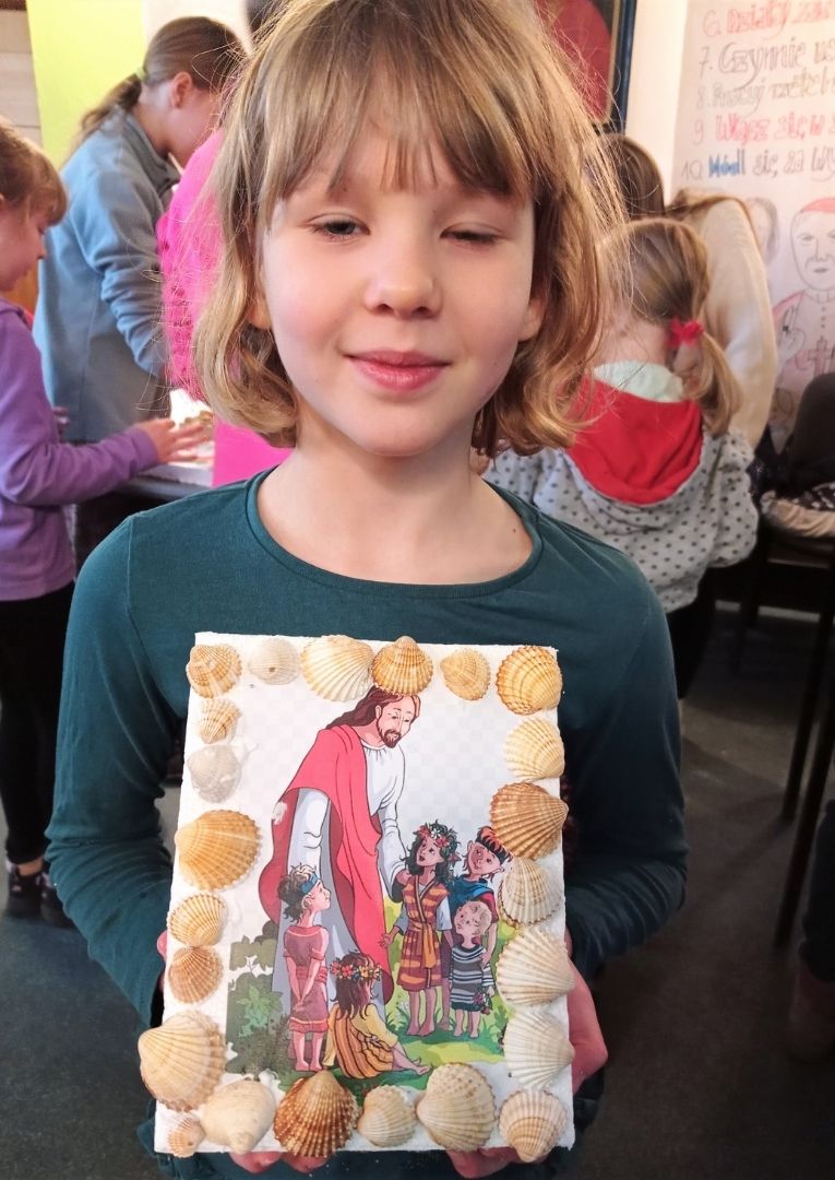 Po modlitwie i śpiewie na chwałę Pana dzieci wykonały z muszelek ramkę do wybranego obrazka. Muszelka, to symbol przyjaźni, ale także mały pojemniczek na łzy. Te łzy płyną z oczu ukraińskich dzieci, które przeżywają lęk i niepewność jutra. Muszelka, jak mały koralik różańca może też symbolizować modlitwę i życzenie o pokój.
